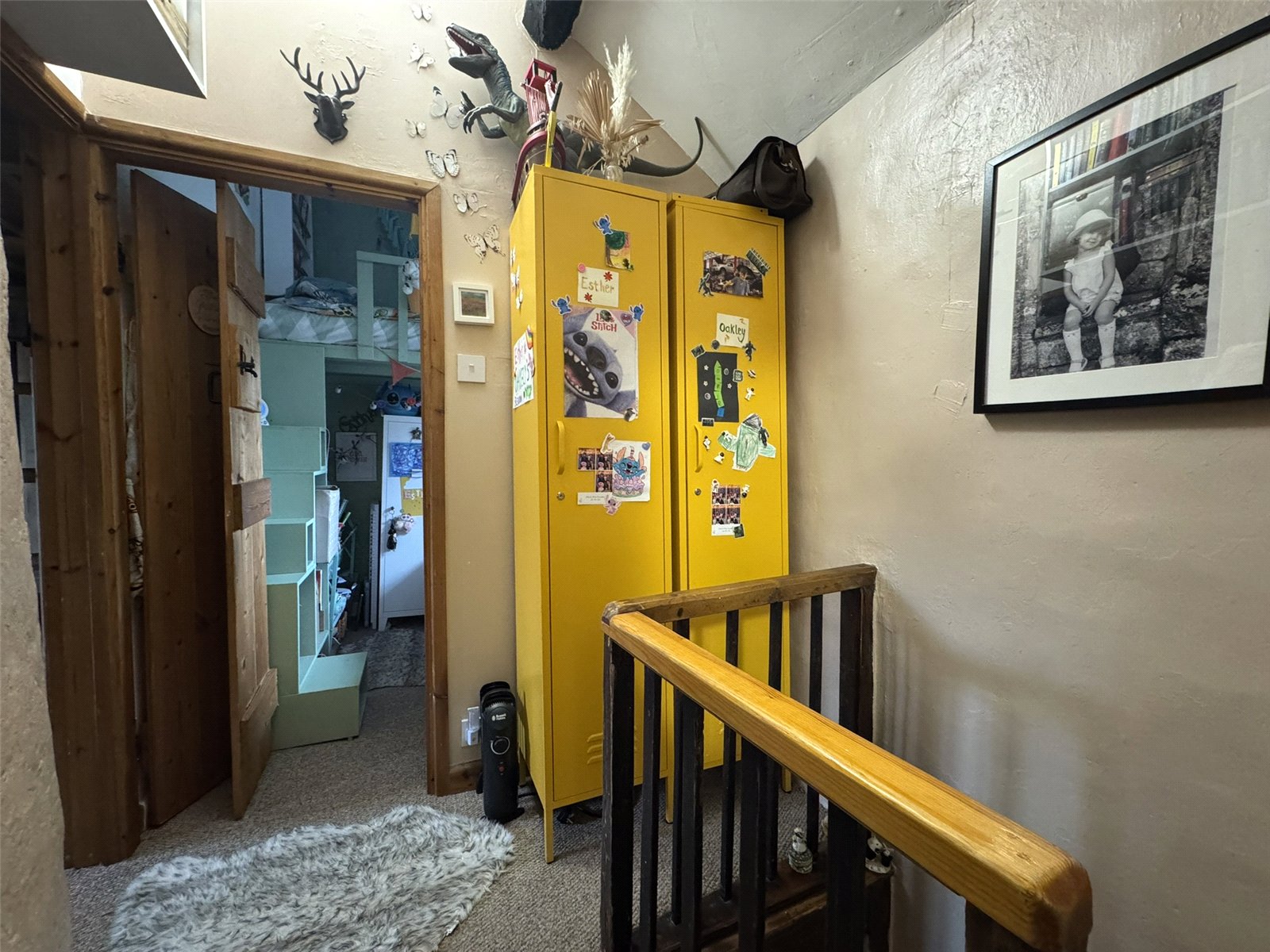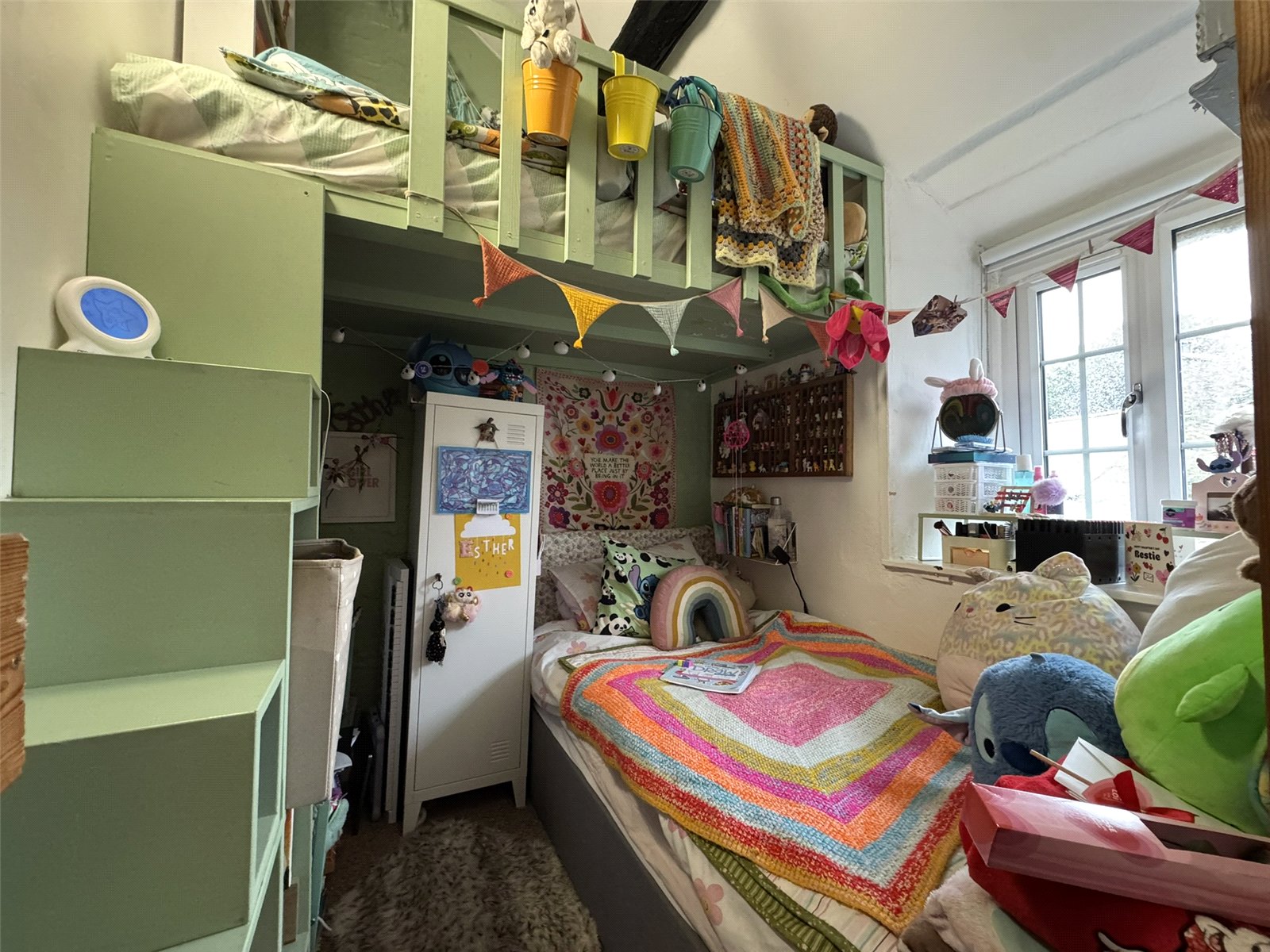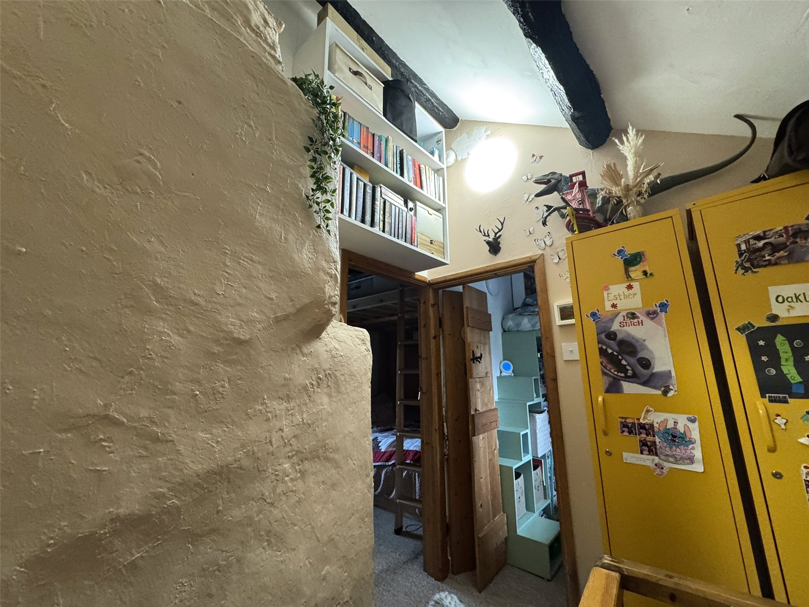 Bedroom 1 (12'9 x 8'7) with exposed purlins, mezzanine storage and bespoke storage built-in to chimney breast, electric panel heater.
