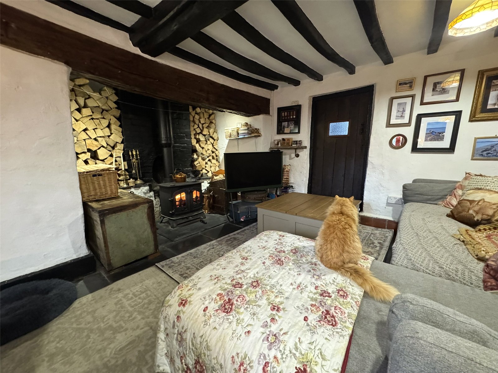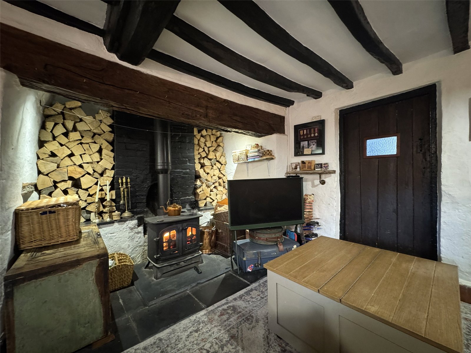 Sitting Room (14'7 x 13'11 max) with exposed beam ceiling and slate flagstone flooring, electric panel heater. Deep Inglenook fireplace with slate heath and oak beam over, wood burning stove inset. Stairs off and step up to