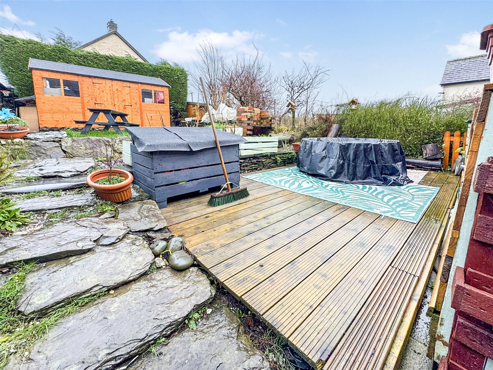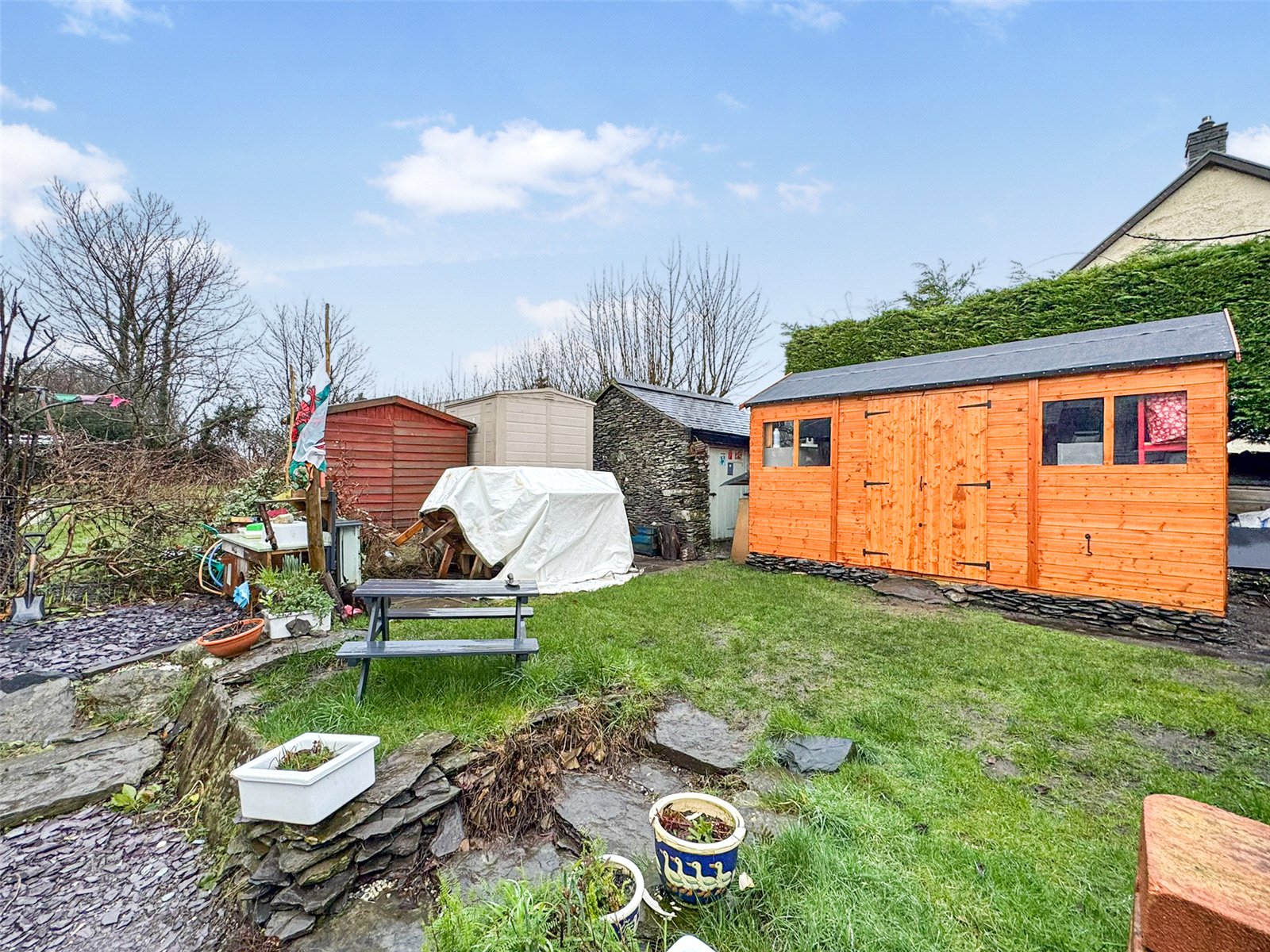 To the front, small courtyard garden with wicket fence boundary and floral shrubs. To the rear, generous garden laid predominantly to lawn with floral borders. Timber decking seating area with stone wall surround. Stone built garden store. Pedestrian right of way noted to rear of garden in favour of adjoining property to gain access to former outside WC. Timber workshop available by separate negotiation.