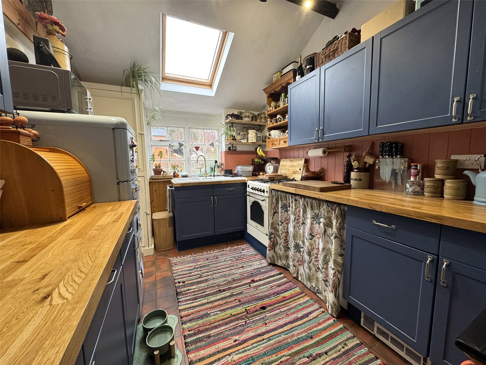 Kitchen (10'7 x 8'5) with a range of shaker style fitted base and wall units to two walls with panelled back splash, ceramic sink unit, quarry tiled floor, plumbing for automatic washing machine, space for gas cooker and Velux roof light. Door to