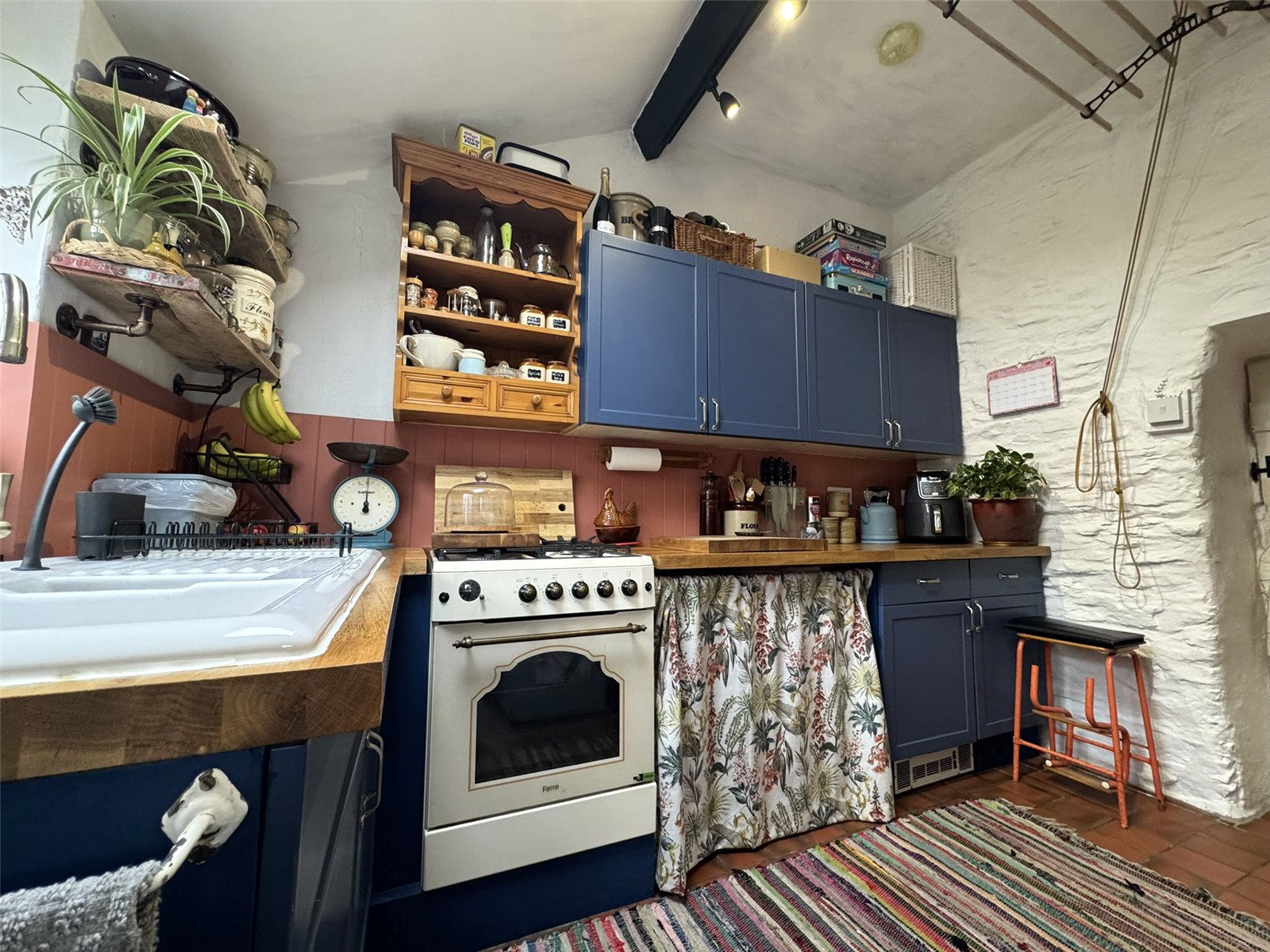 Shower Room (6'9 x 5'3) separate shower cubicle with tiled surround and electric shower over, WC, hand wash basin, Velux roof light and feature glazed window showing original bread oven. Rear external door.
