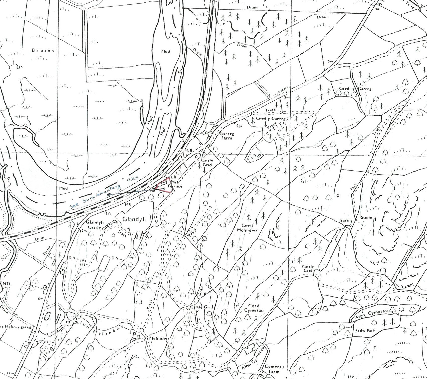 To the front, level enclosed foregarden laid to lawn with stone frontage to layby beyond, floral borders and paths providing access to Front Porches. To the side of the terrace, a tarmac off-road parking area for 2-3 cars and an adjoining enclosed, sizeable garden area laid to lawn with path leading across the back of the terrace. To the rear, steps ascend to a raised upper garden arranged as an open lawned area. From here views across the Dyfi Estuary and surrounding hillside can be enjoyed. Two lean-to stone built Stores (10' x 10' each) with perspex roofs, electricity. One has water supply and drainage connection.