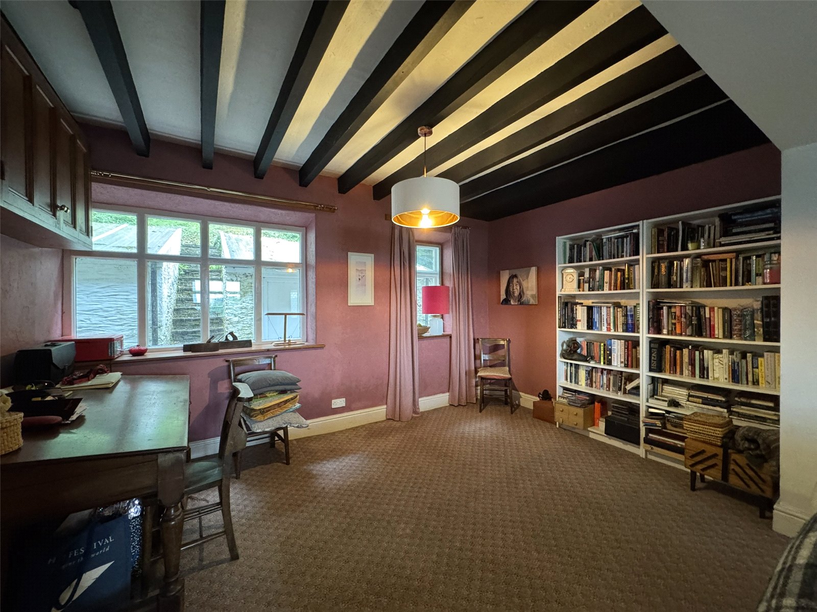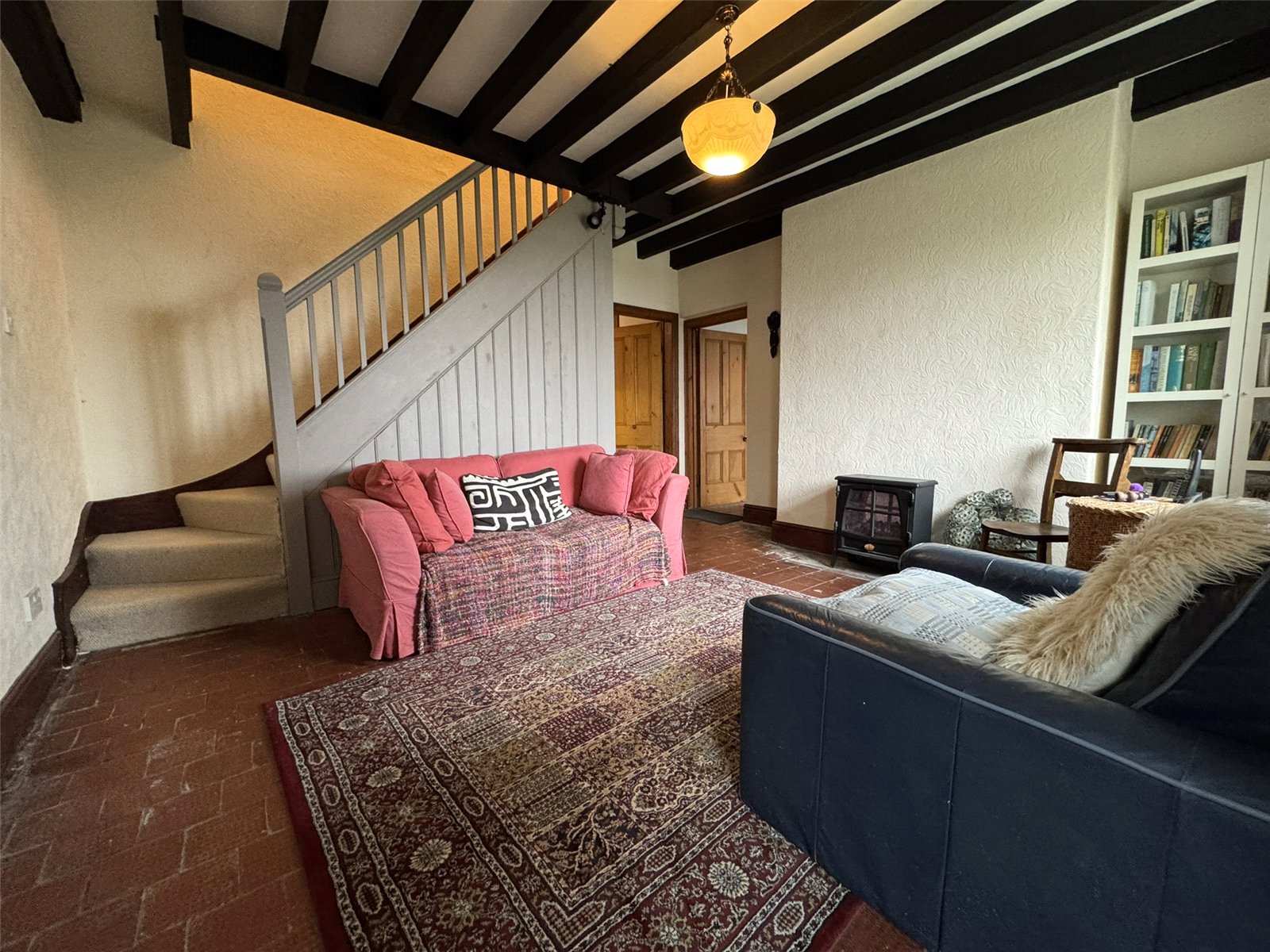 Living Room (14'3 x 24'5) with dual aspect windows to front and rear elevation. Feature brick fireplace with stone surround and slate hearth with Chilli Penguin stove inset. Beamed ceiling, two storage heaters, cupboard housing consumer unit. Door to