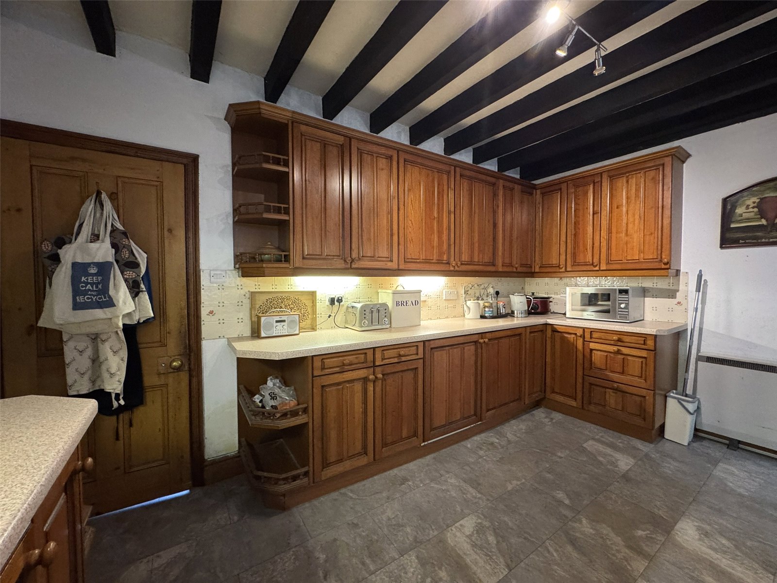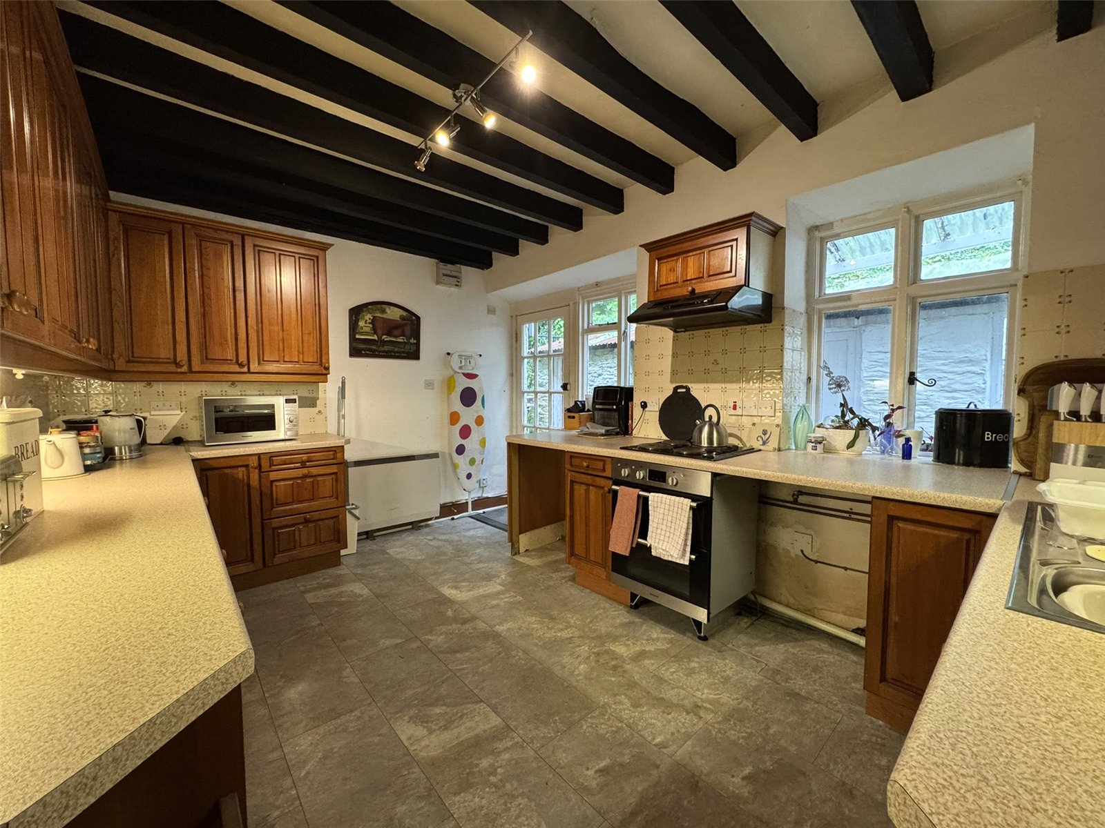 Kitchen (9' x 14'6) with range of base and wall cupboards to 4 walls, inset stainless steel 1.5 bowl sink unit, integrated double oven with electric hob and extractor hood over, space and plumbing for washing machine and dishwasher, integrated fridge/freezer below counter. Two windows to rear, storage heater, tiled splashbacks, laminated flooring and beamed ceiling. External door to rear.