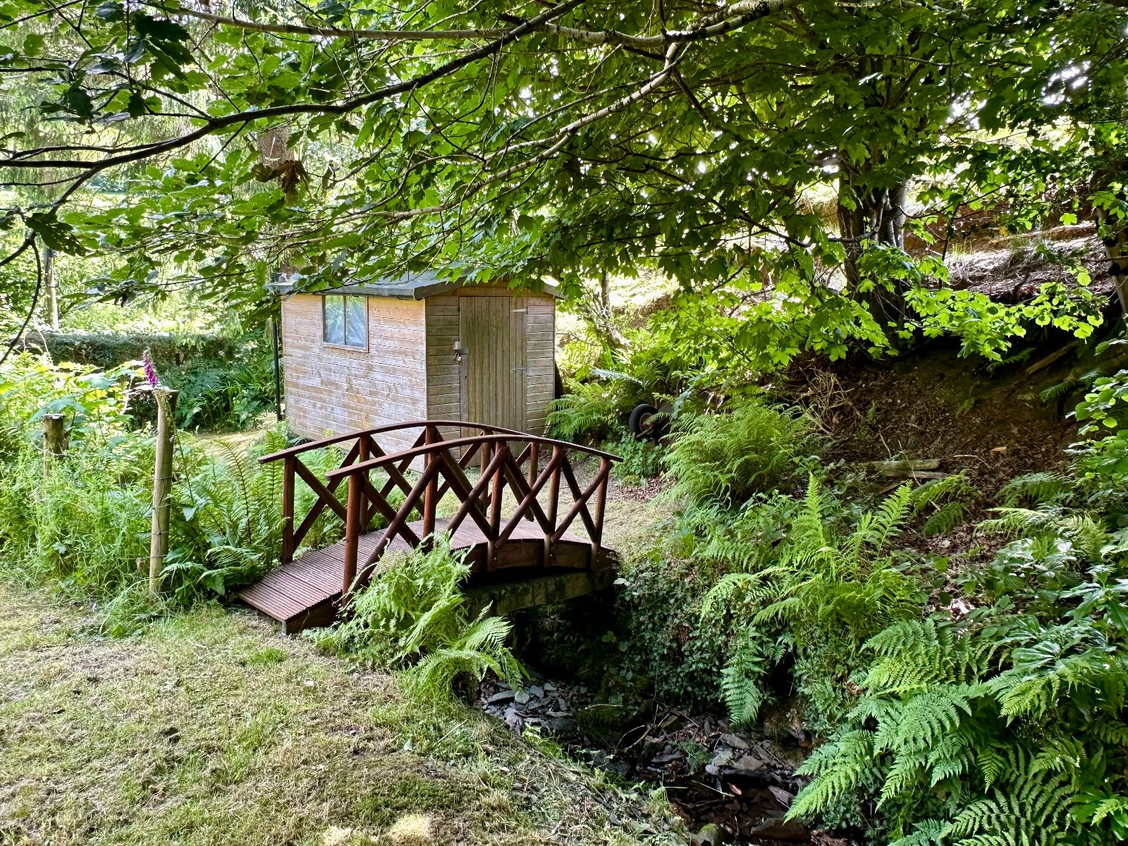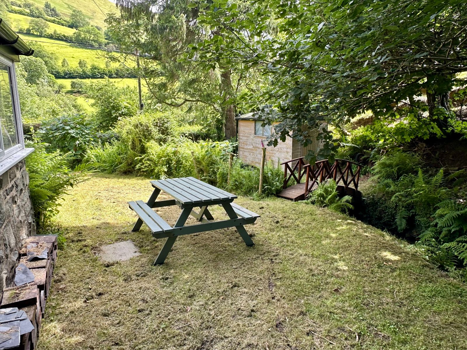 To the sides and rear are gentle sloping lawned gardens with an open aspect across open fields to the side and enjoy views to the front across the valley. There is a stone outbuilding/potting shed to the rear and oil tank for the Rayburn. The property borders a stream that has a wooden bridge over, that leads to a further piece of land with a shed.