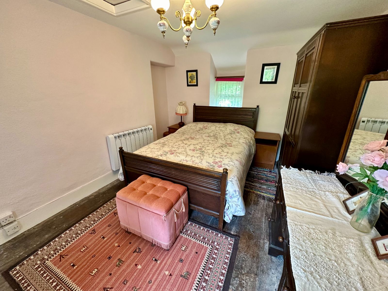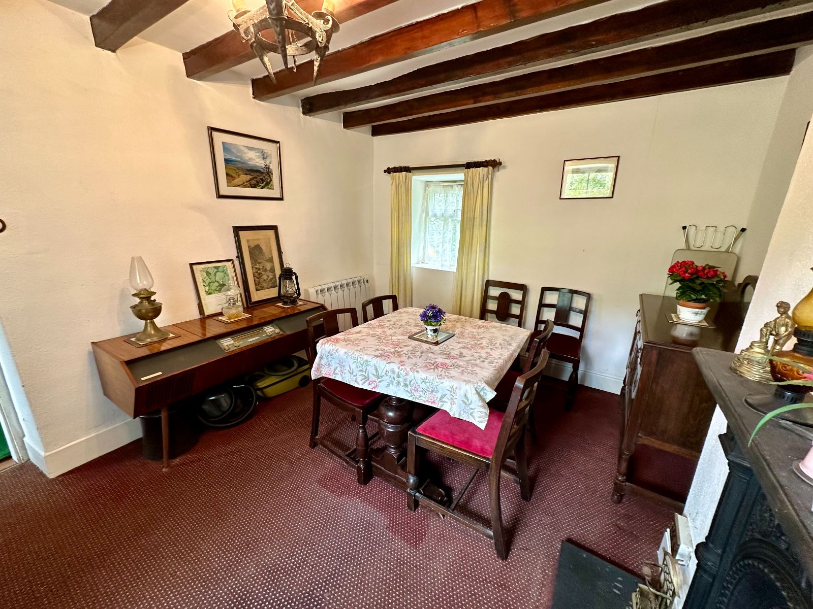 Window to front and rear, beamed ceiling, cast iron fireplace with slate hearth, wifi electric heater, carpet.