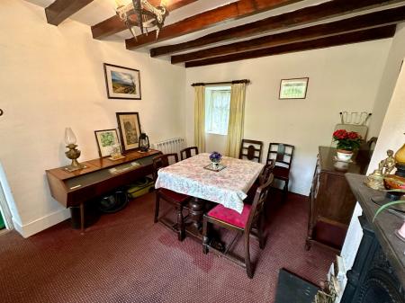 Beamed ceiling, 4 wall units, 5 base units under a timber worktop, Belfast sink, space for fridge, space for dishwasher, space for electric cooker, oil fired Rayburn, window to side, electric heater, slate flag flooring.