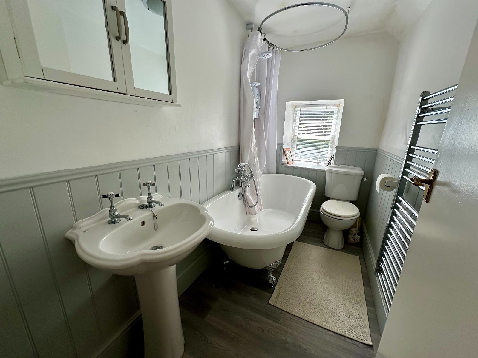 WC, wash hand basin, roll top bath with hand held mixer shower attachment, electric shower over, heated towel rail/radiator, part tongue and groove panelling, window to side, cushion flooring.