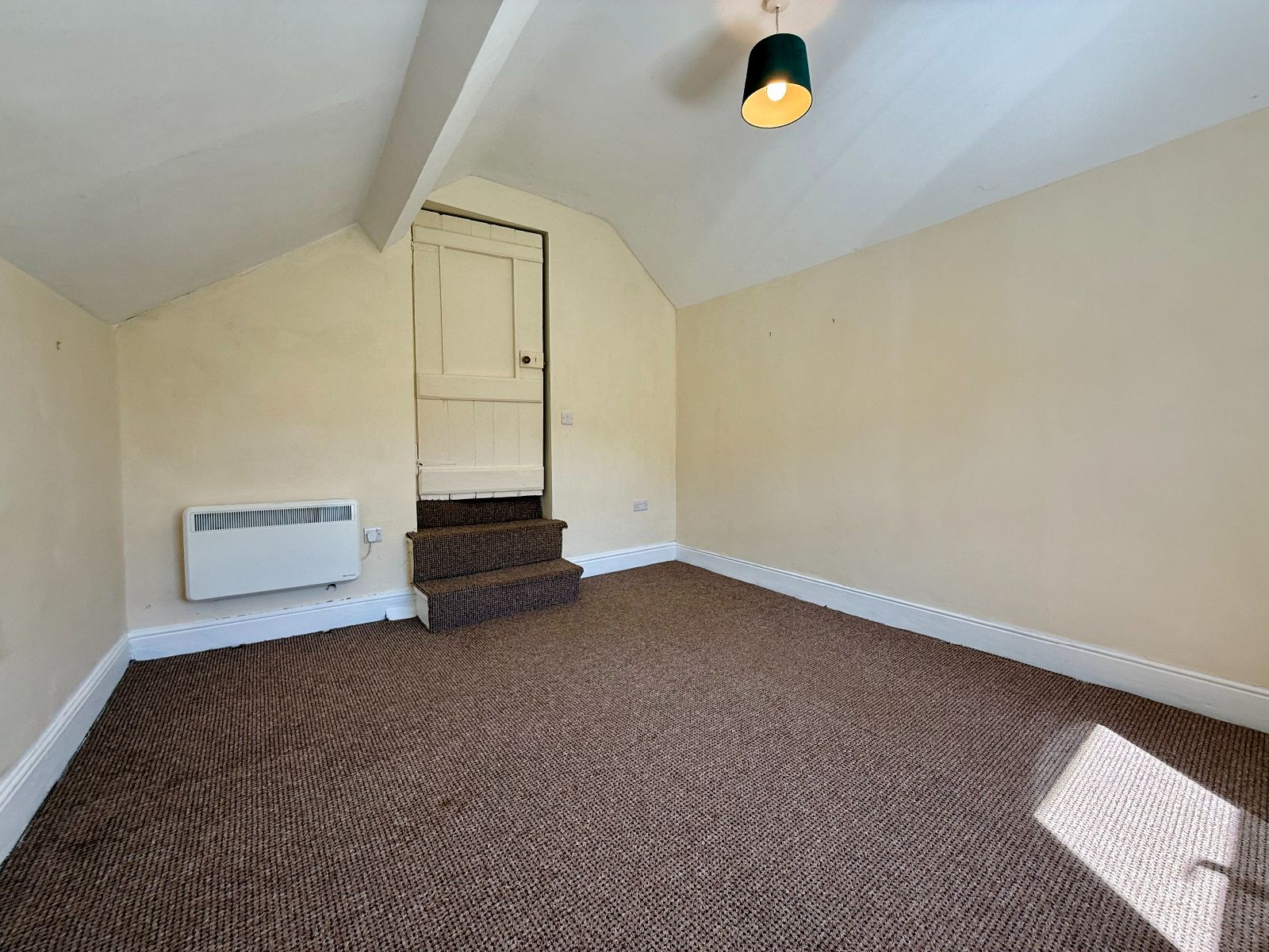 Window to front with countryside views, window to rear, exposed beams, under eaves storage, night storage heater, carpet.