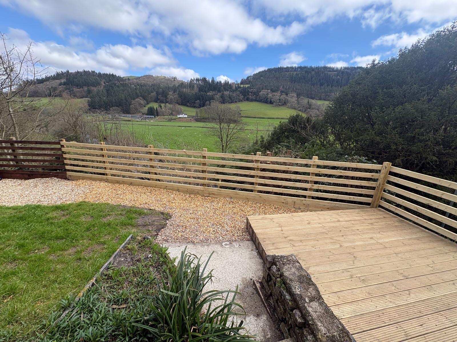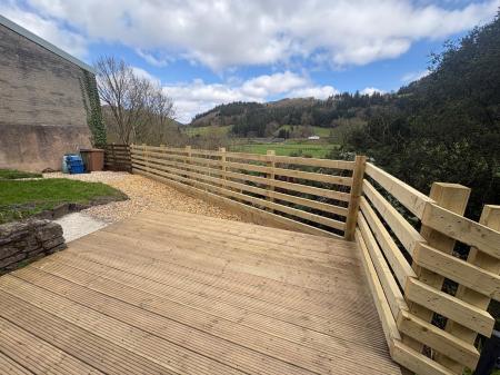 Rear open vestibule area, patio seating area with steps down to decking and lawn area enjoying the open countryside view. There is a Right of Way over the neighbouring property, leading to the road.