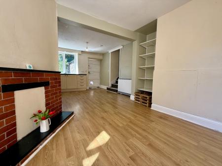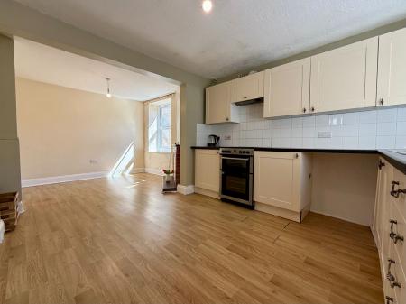 Window to rear, door and window to side, 4 wall units, 5 base units under a marble effect worktop, stainless steel sink and drainer, tiled splash back, space for an electric cooker with extractor hood above, space and plumbing for a washing machine, night storage heater, feature fireplace, laminate flooring.
