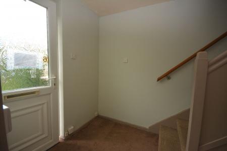 Door to front, understairs storage, staircase to landing, carpet.