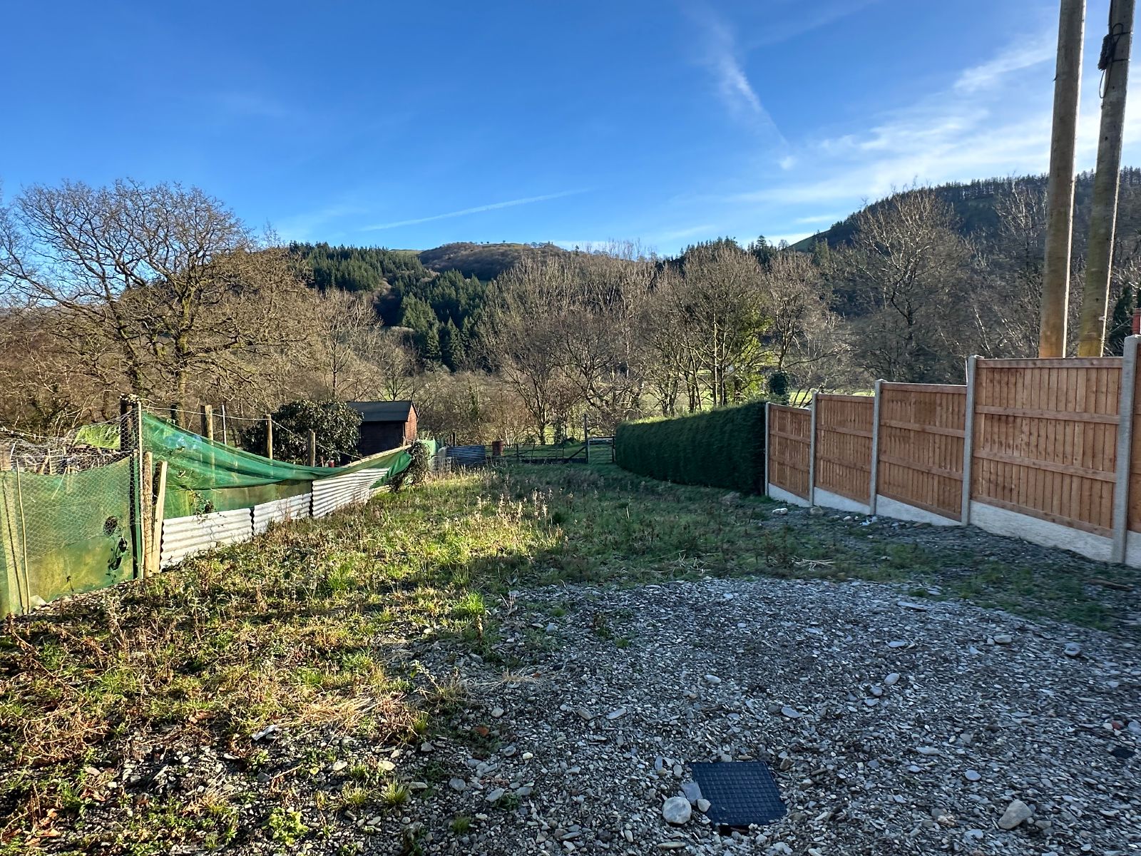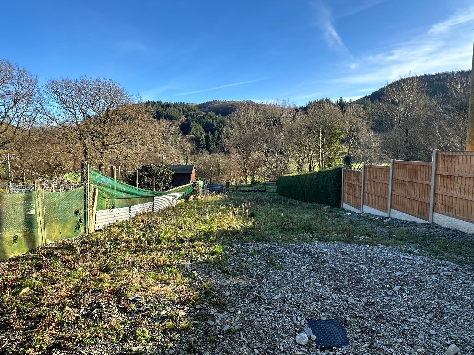 Gated side access with coal bunker and woodstore.