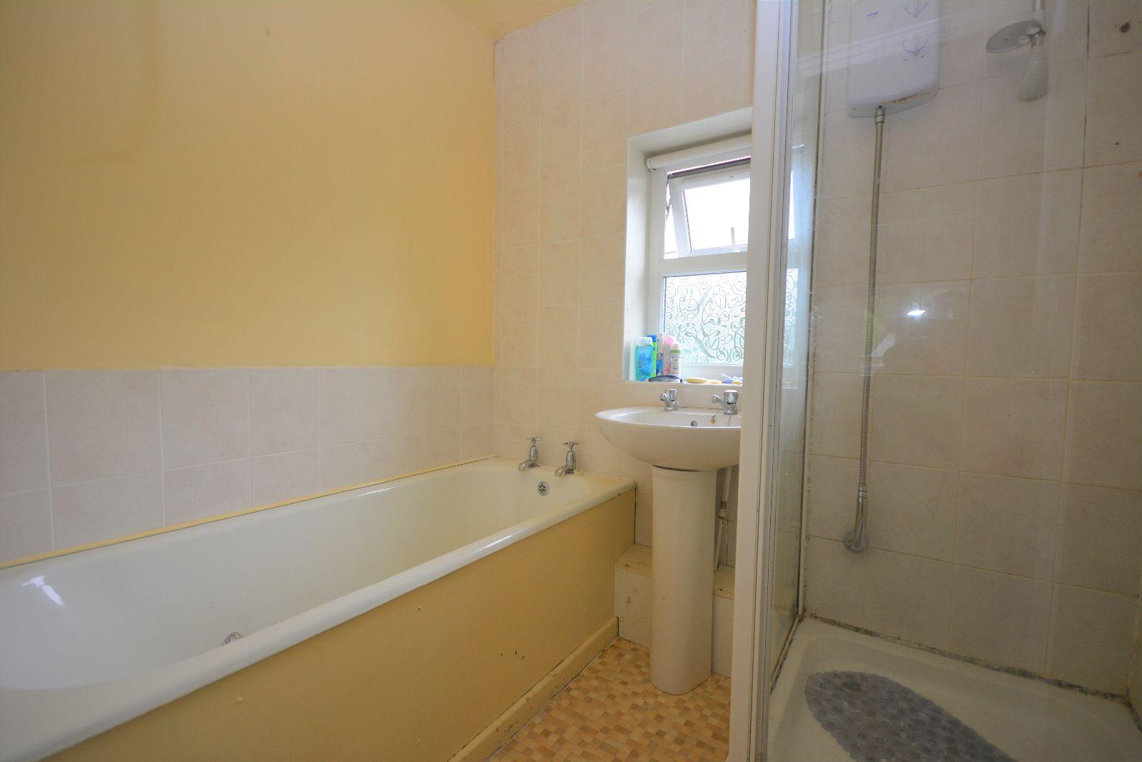 Window to rear, panelled bath, partly tiled walls, pedestal wash hand basin, shower cubicle with electric shower, cushioned flooring.