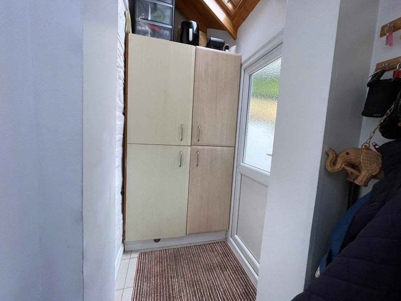 Side Lobby; built-in full height amenity cupboards with space for freezer and tumble dryer, 2 velux roof lights, ceramic tiled floor, half glazed door.