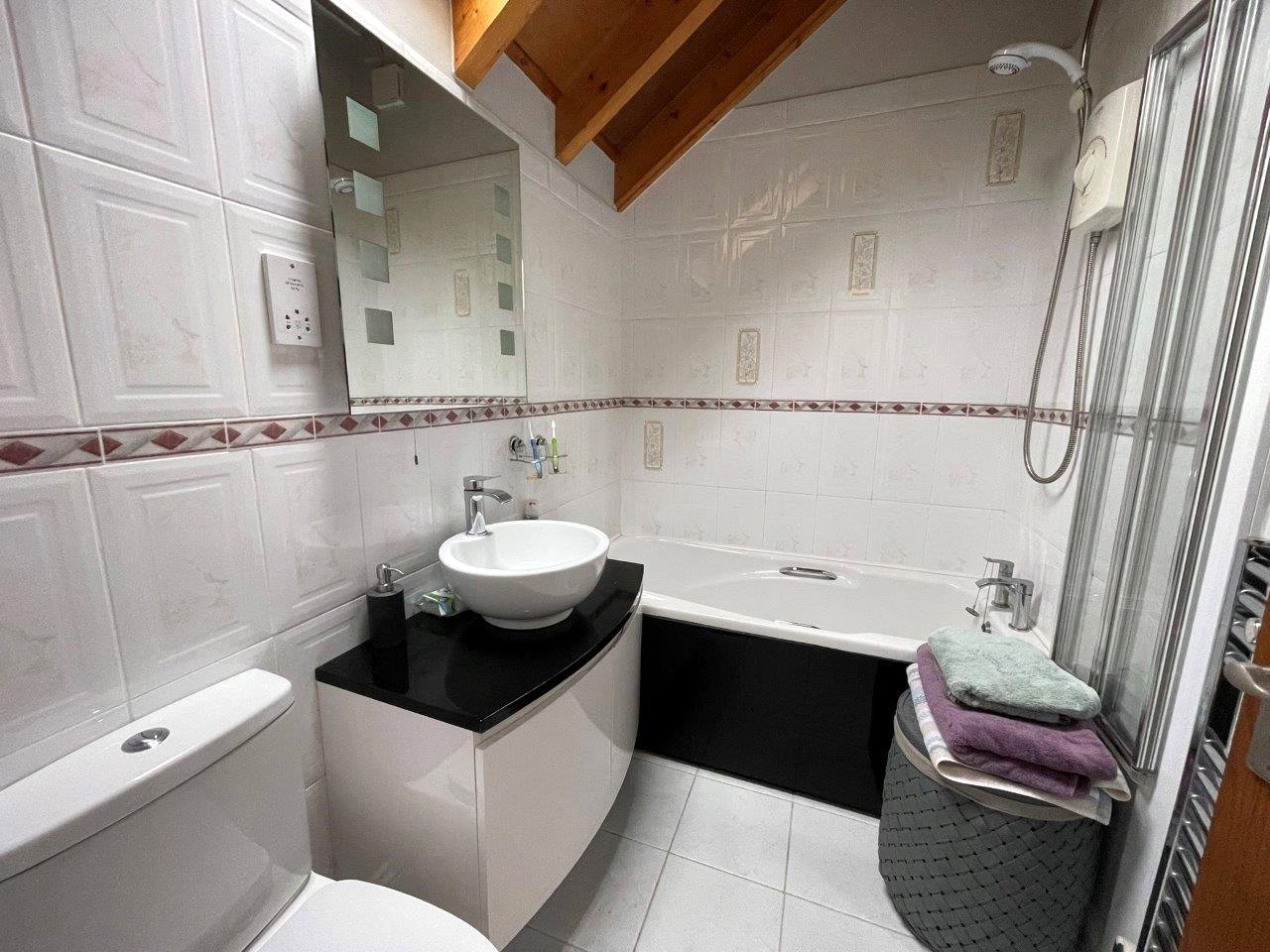 Bathroom (7'4 x 5'); low flush WC, vanity wash basin, panelled bath with electric shower over, shaver point, velux window, exposed beam ceiling, heated towel rail, wall hung electric fan heater.