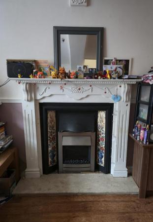 Brown door upon entry, wooden flooring, white skirting boards, walls half painted purple half painted white, one window overlooking front, one window overlooking rear, two radiators, various plug sockets, electric fireplace.