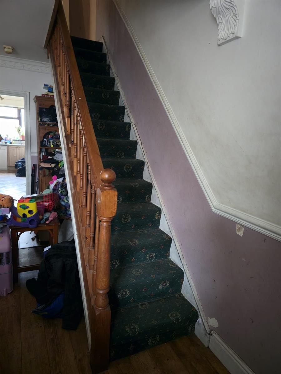 Green carpeted stairs, wooden bannister, one dual plug socket, one wall half painted purple and half painted white.
