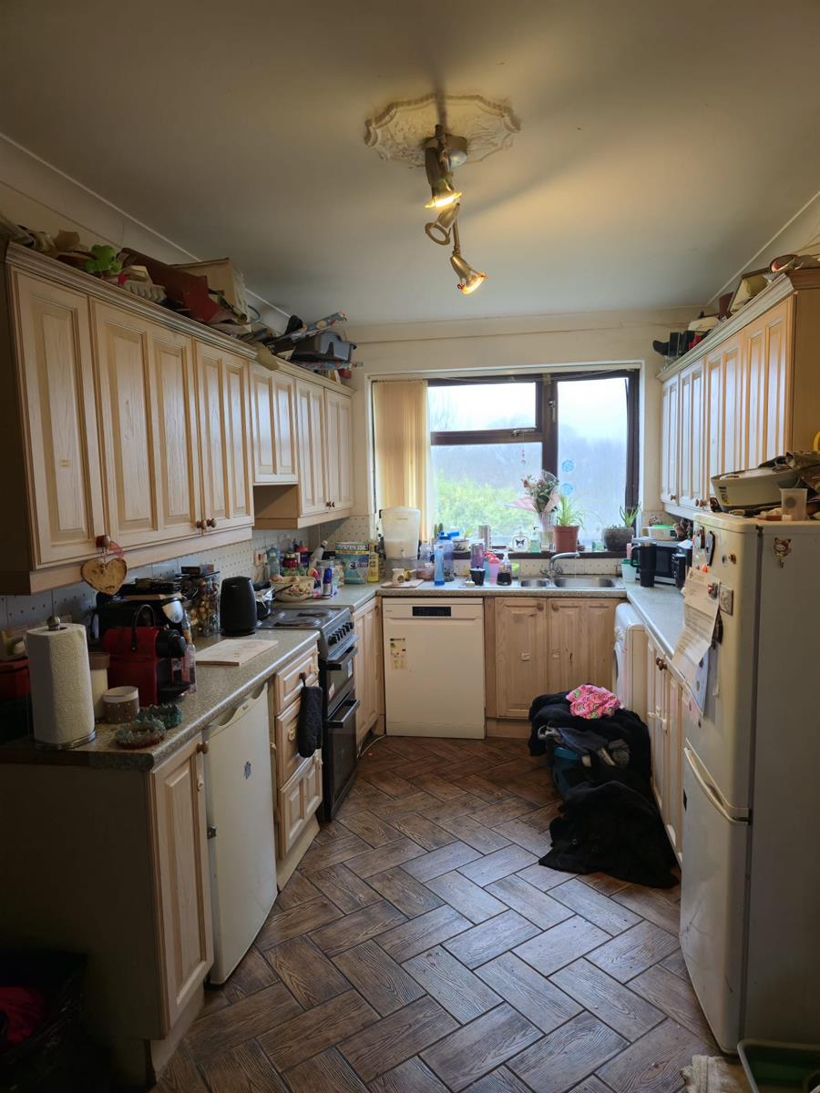 Brown door upon entry, brown flooring, white walls, beige cabinets, stone affect worktops, white tiling surrounding appliances, one window overlooking rear, storage cupboard with white door upon entry, four dual plug sockets.