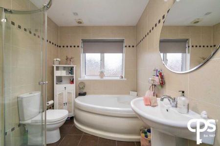 Fully tiled four-piece bathroom suite comprising of a corner shower, corner bath, WC and wash hand basin.