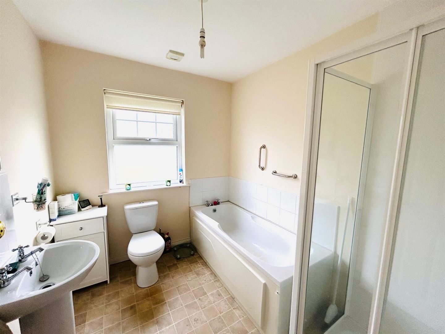 Comprising bath with tiling around, walk in electric shower with PVC cladding to walls, whb with tiling around, wc, extractor fan.
