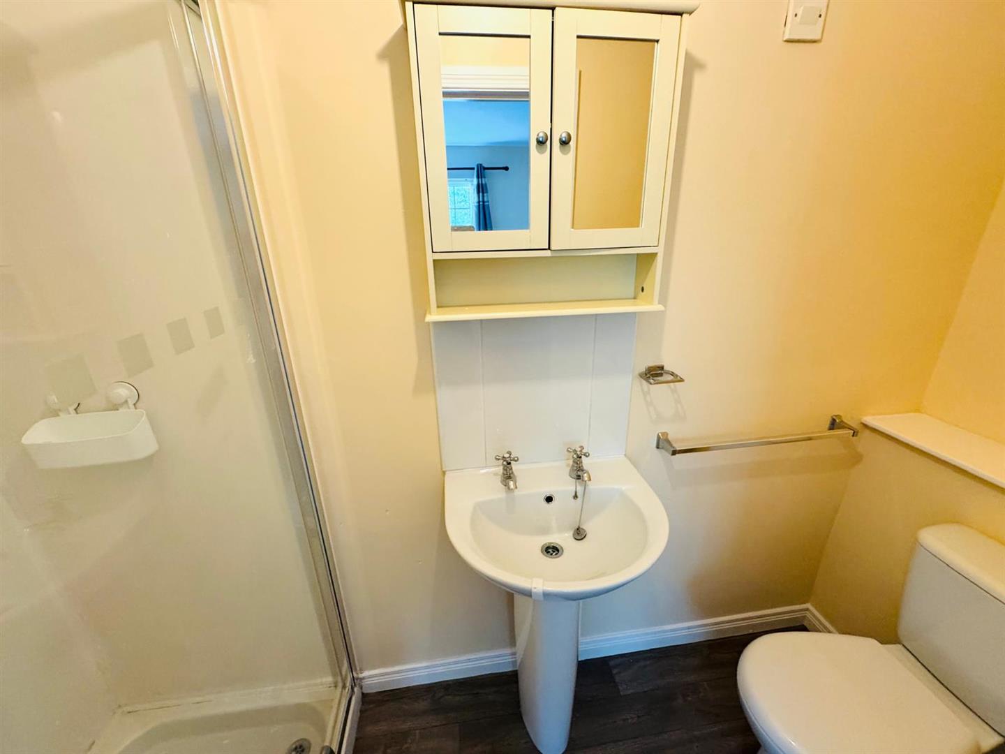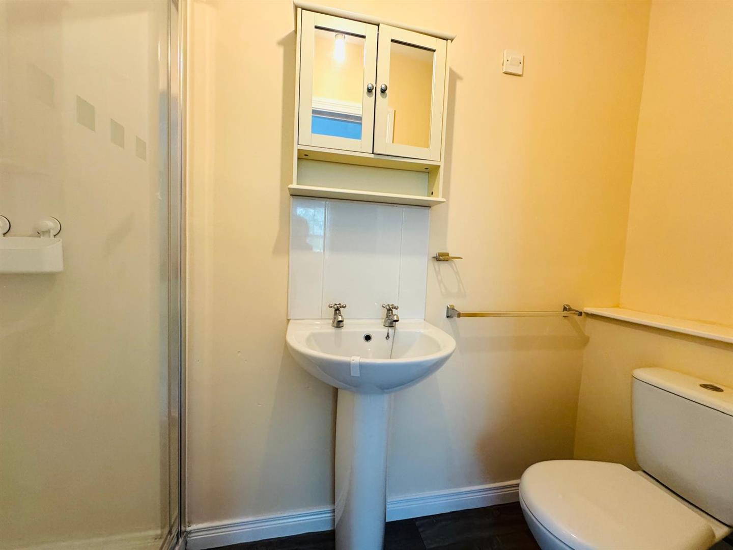 Comprising walk in electric shower with PVC cladding to walls, whb with tiling around, wc, extractor fan.
