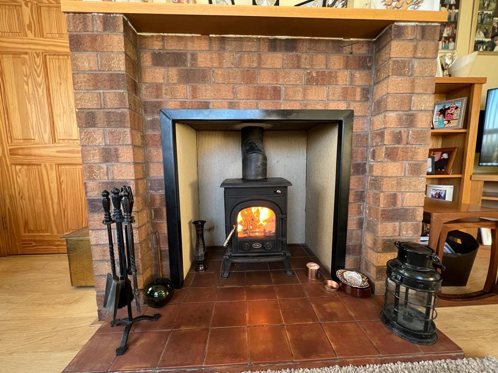 5.08m' x 3.53m' (16'8' x 11'7') - Ceiling cornicing; multi fuel stove set in brick surround; tiled hearth; laminate wooden floor; double Georgian glazed doors to:-