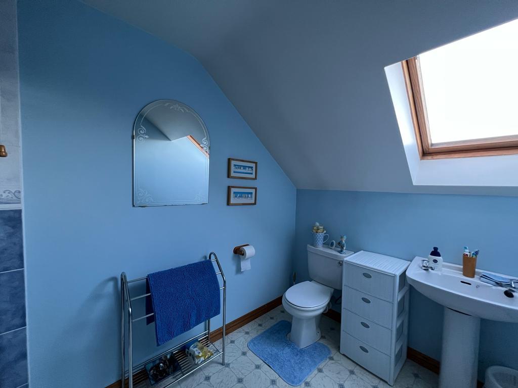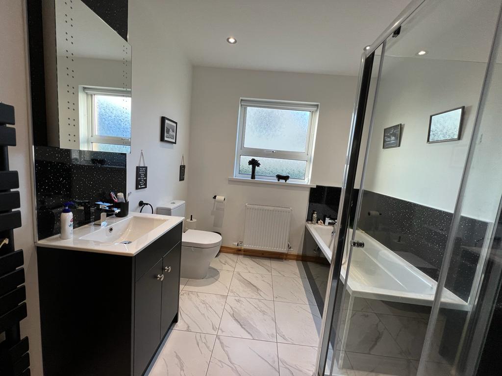 Comprising bath with telephone hand shower to taps; walk in shower; wash hand basin set in vanity unit; mirror with Bluetooth, heated mirror, shaver point; WC; tiled floor; recessed ceiling lights;