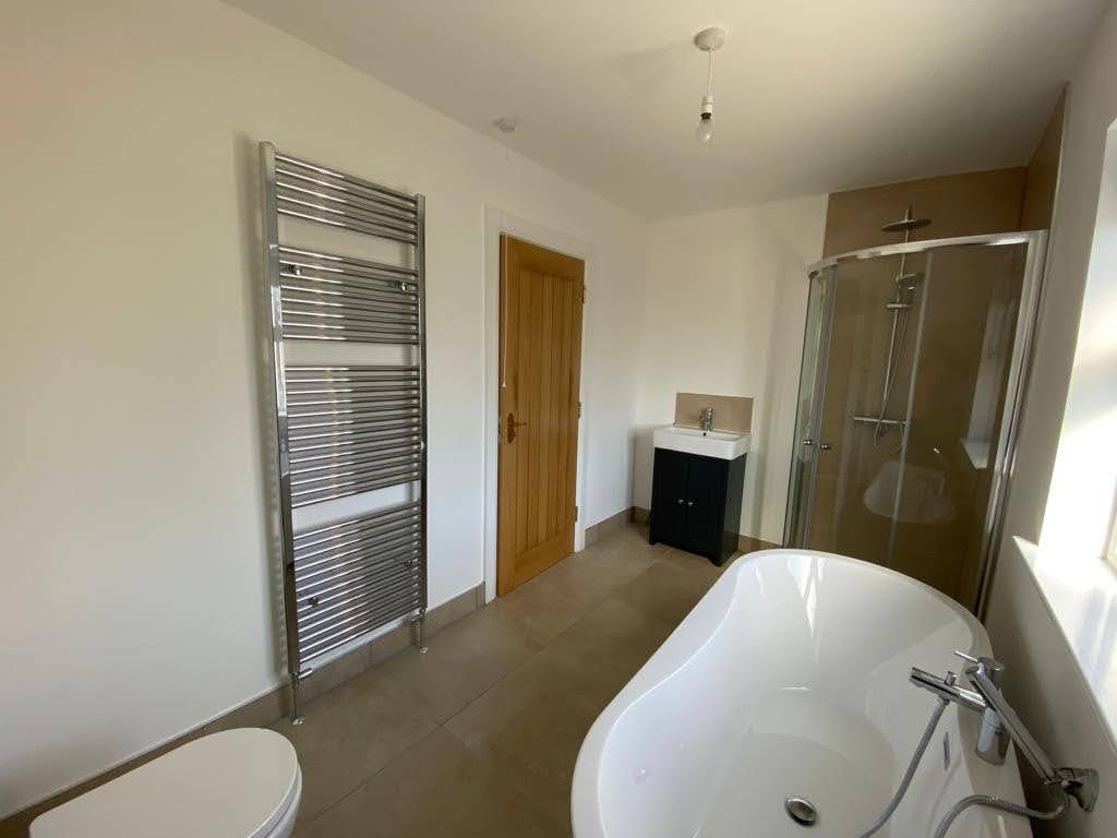 Comprising of free standing bath with shower attachment to taps, whb set in vanity unit, wc, fully tiled walk in shower, heated chrome towel rail, extractor fan, tiled floor.