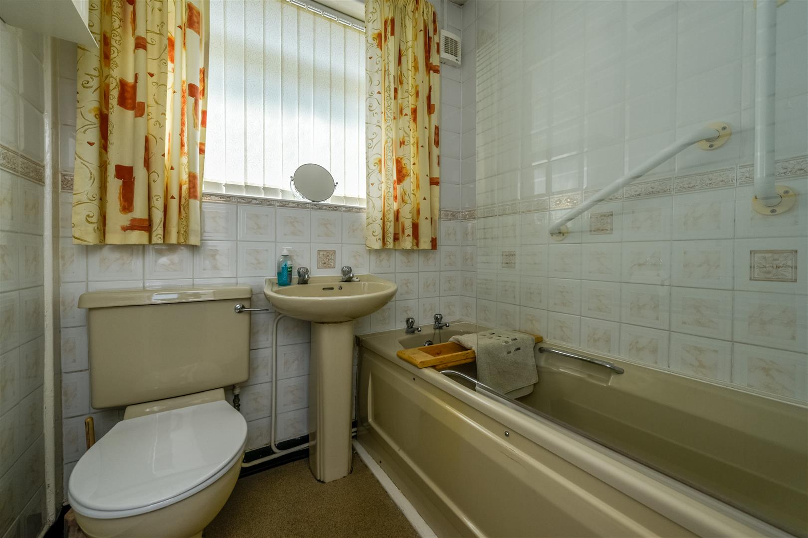 Bathroom - coloured suite comprising bath with Triton electric shower over, pedestal wash hand basin, low level w.c, tiled walls, double glazed window