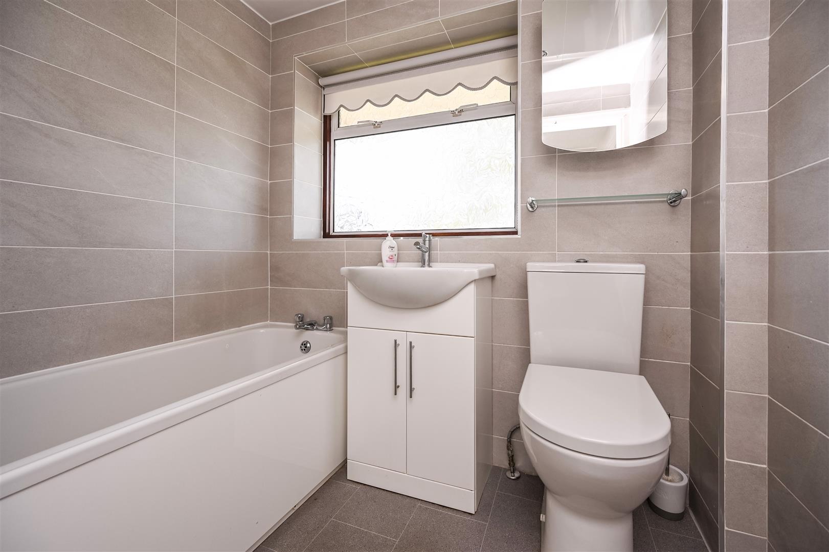 Bathroom - bath with mixer tap, wash hand basin in vanity unit, low level w.c, tiled walls, double glazed window