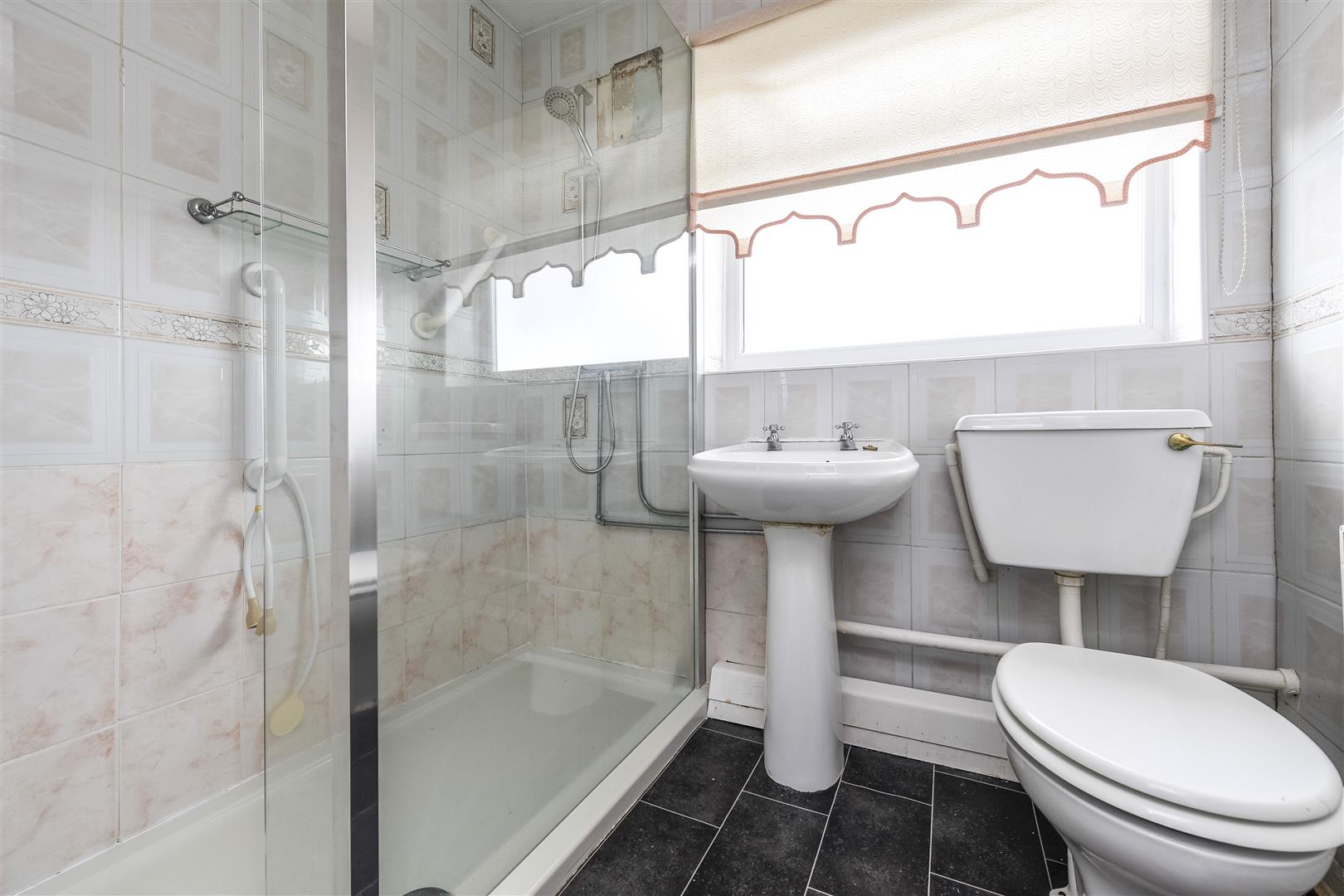 Shower Room - shower cubicle with mixer shower, pedestal wash hand basin, low level w.c, tiled walls, radiator, double glazed window