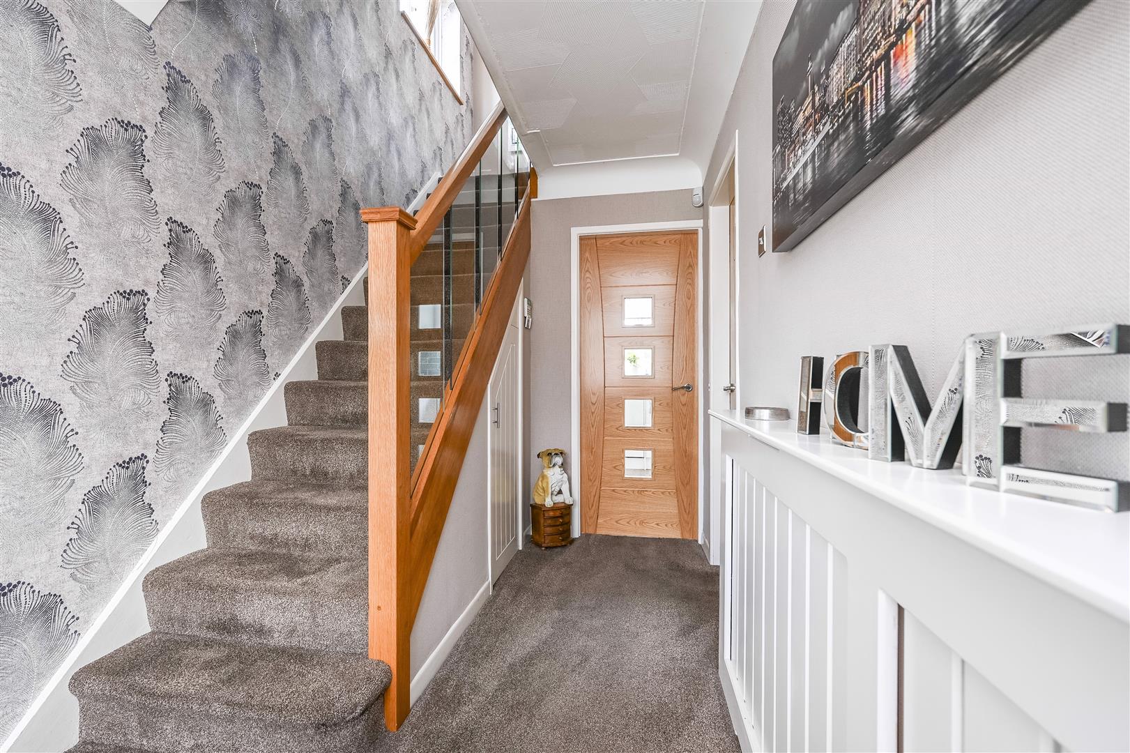 Entrance Hall - meters cupboard, contemporary oak and glass feature staircase, under stairs storage cupboard, radiator