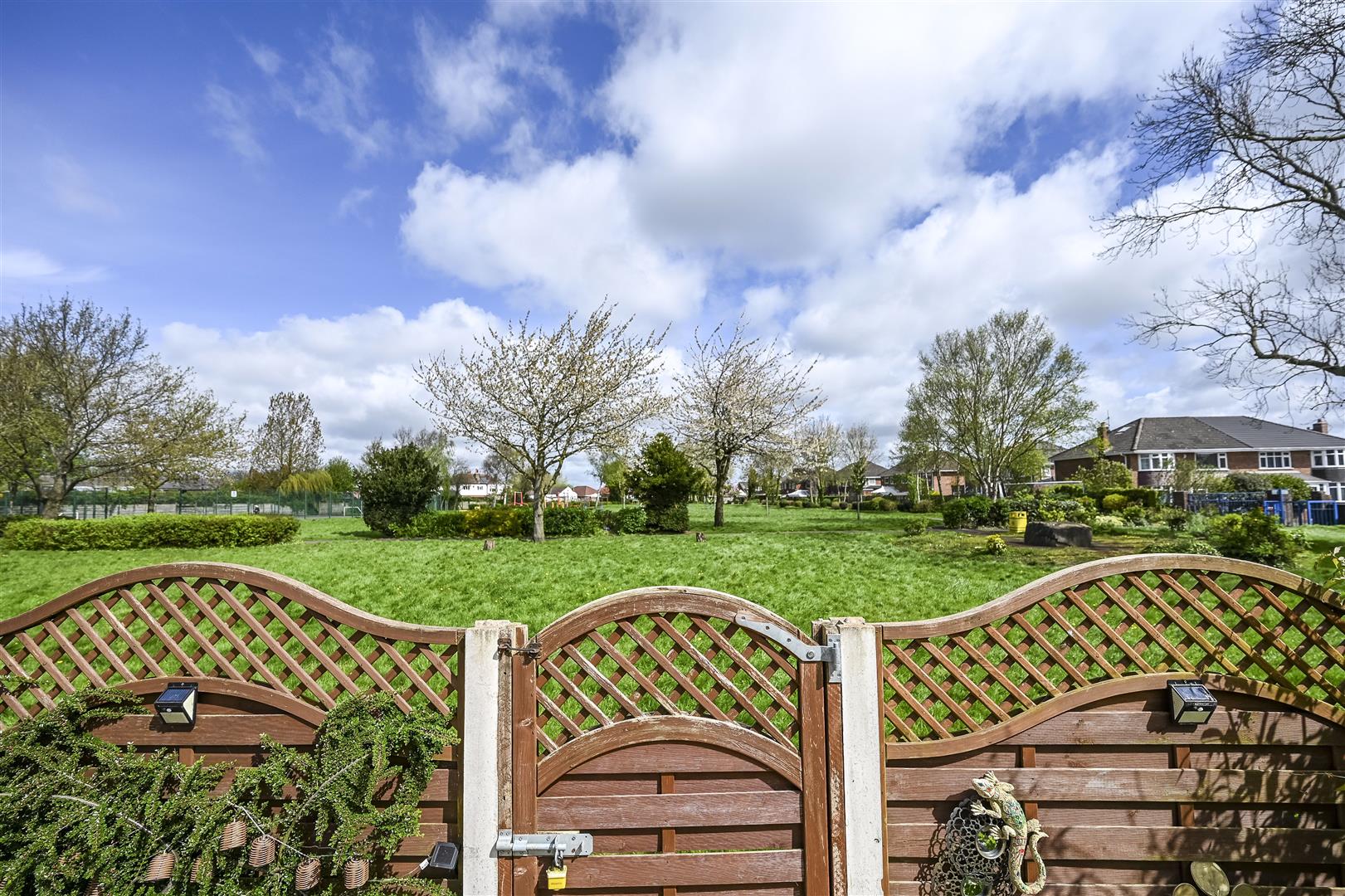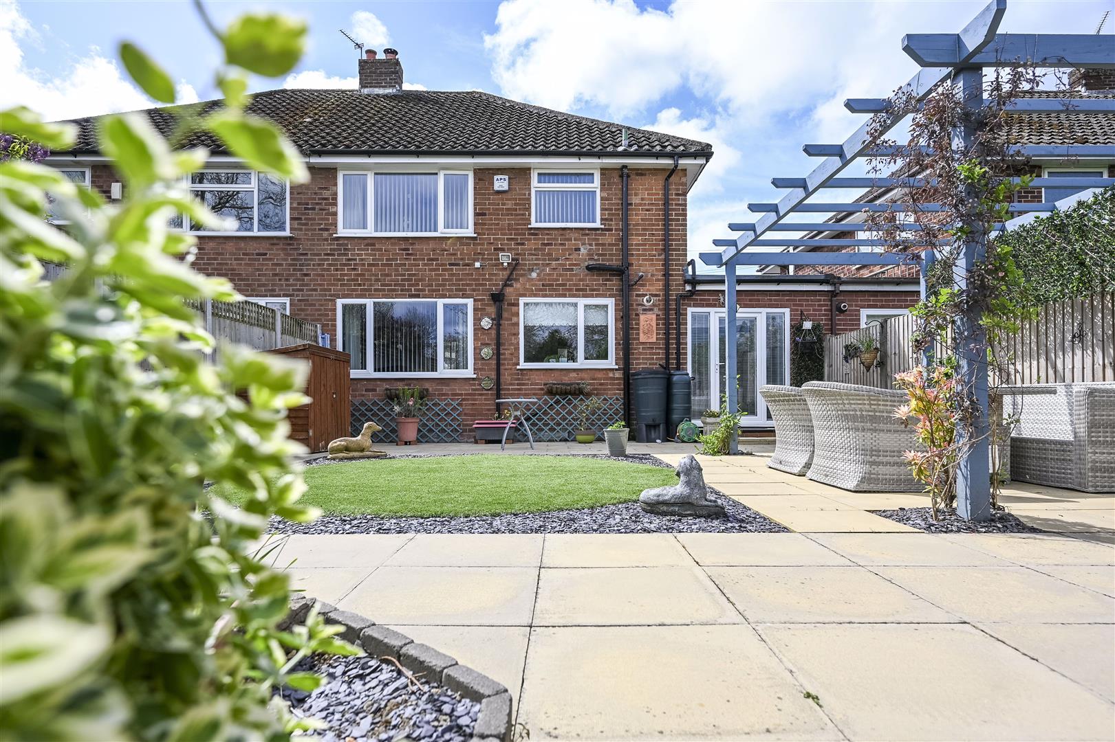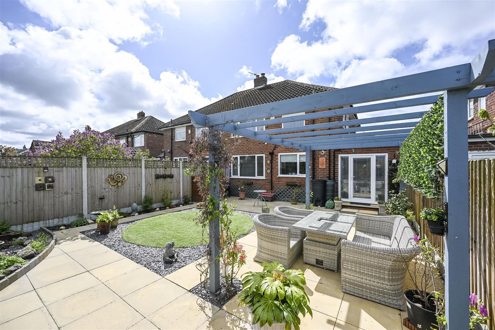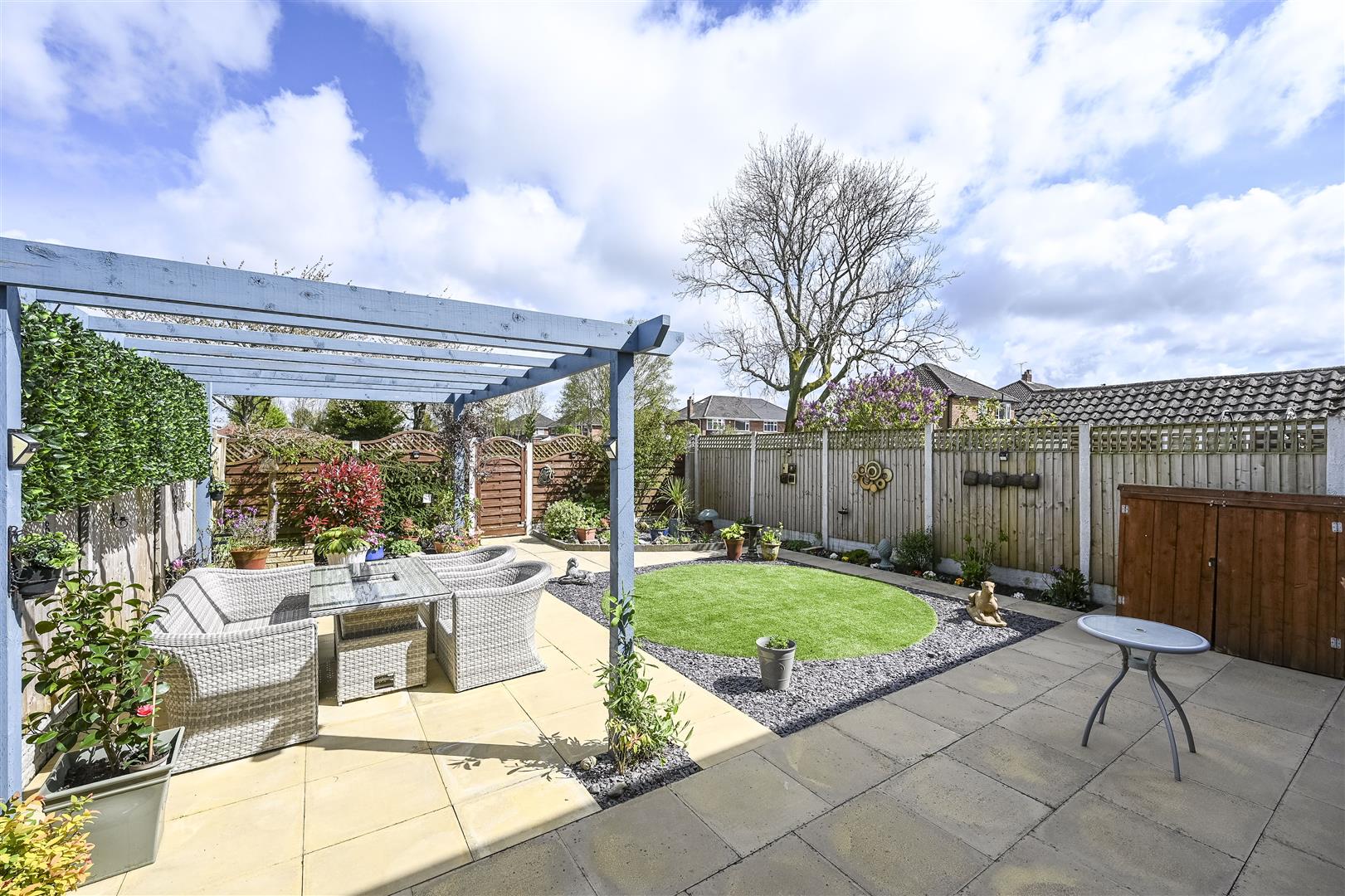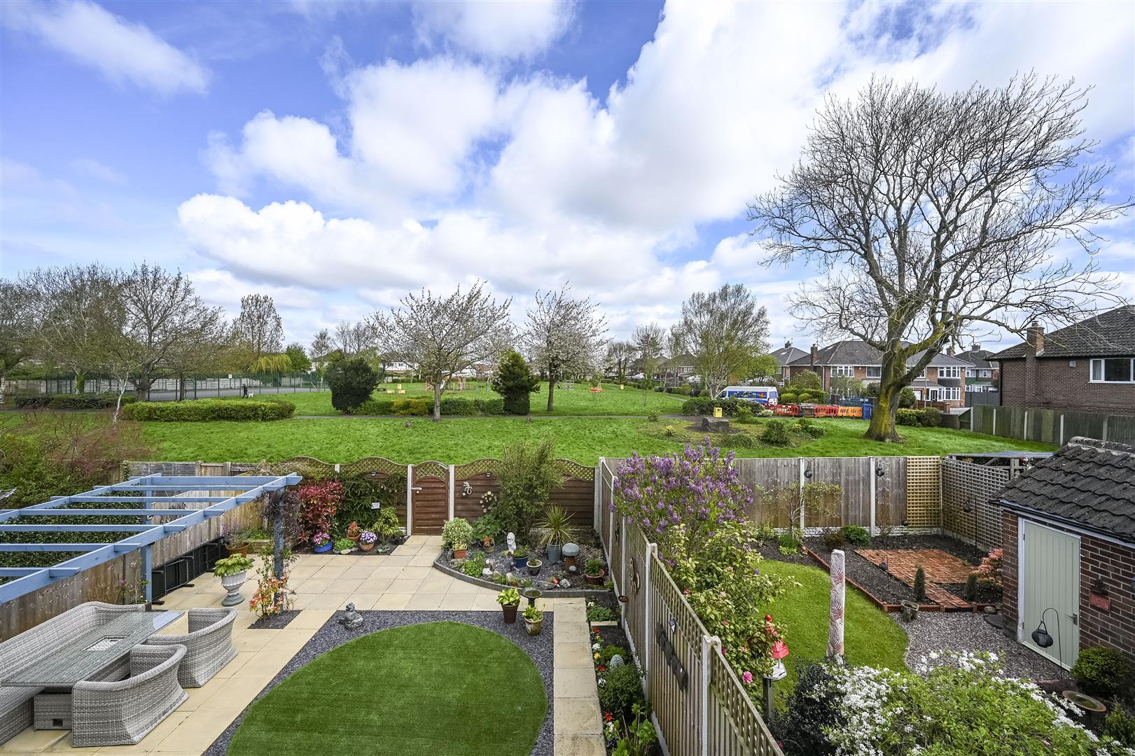 Outside - driveway with parking for cars leading to garage, rear garden that overlooks the park so isn't overlooked with paved areas, circular artificial lawn, timber pergola, various areas for planting, outside tap