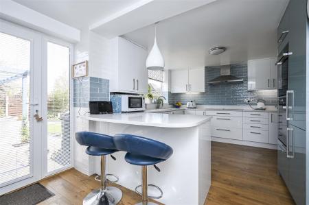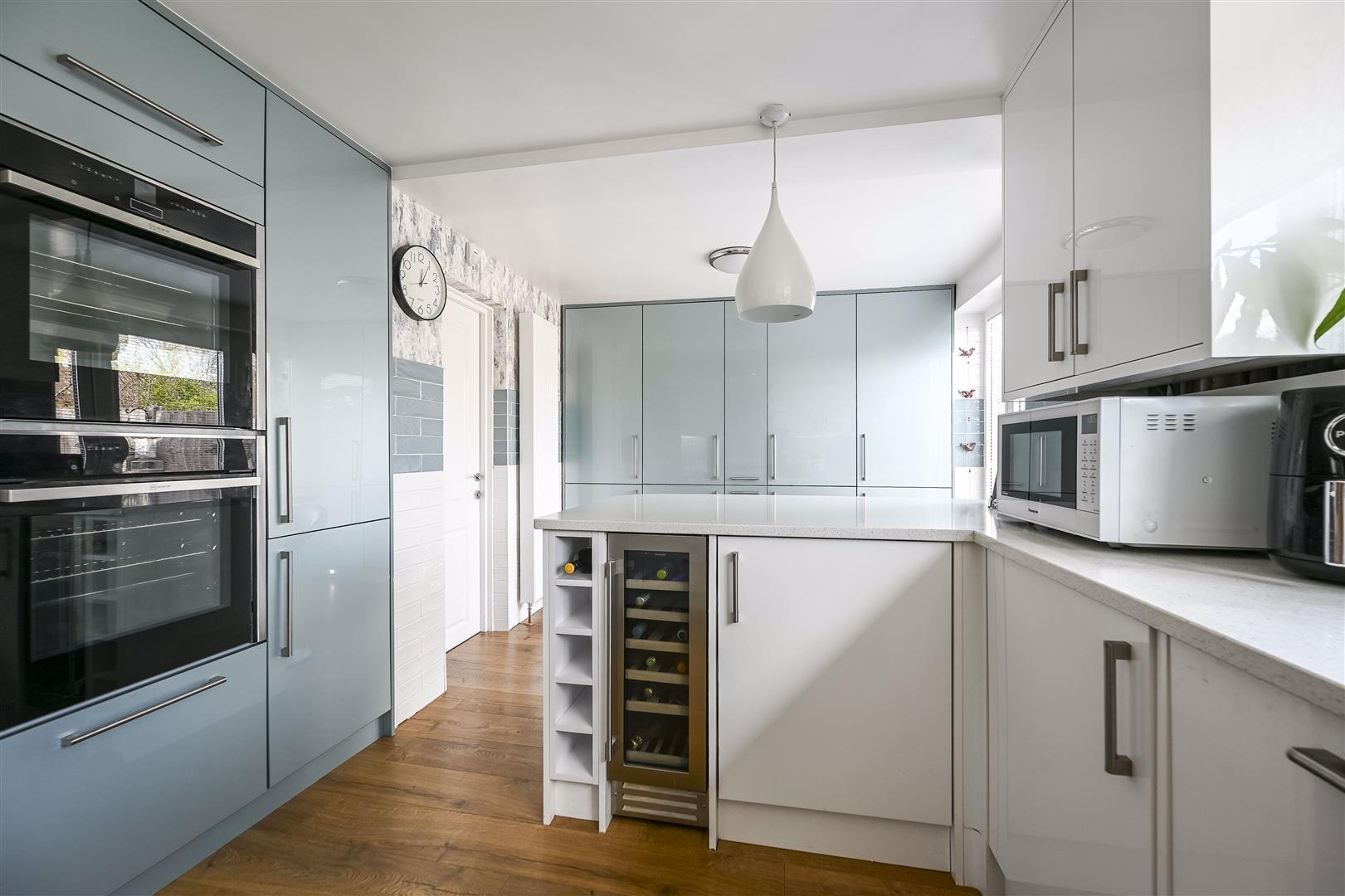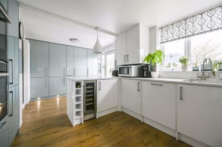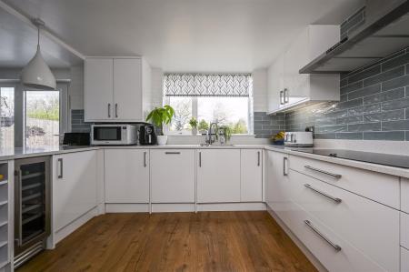 Kitchen/Breakfast Room - inset one and a half bowl sink unit with drainer in worktop surface, base and drawer units with Quartz worktop surfaces over including breakfast bar, integrated appliances including Neff electric hob, Neff double electric oven with slide and hide doors, dishwasher, wine cooler, low fridge, full size fridge and separate freezer, laminate floor covering, radiator, double glazed window, double glazed door to rear garden
