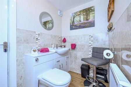 Cloakroom - low level w.c, wash hand basin in vanity unit, laminate floor covering, part tiled walls, radiator, door to garage