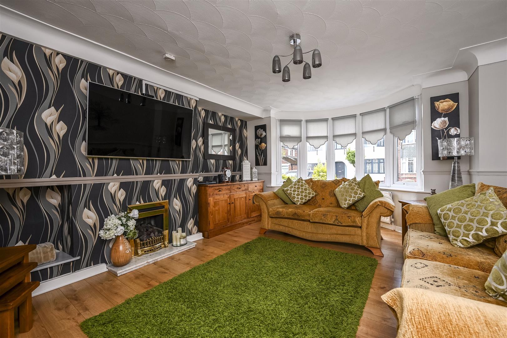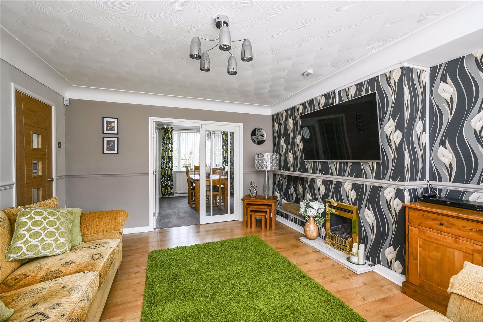 Living Room - feature fireplace with gas fire, laminate floor covering, radiator, double glazed bay window, double doors to:-