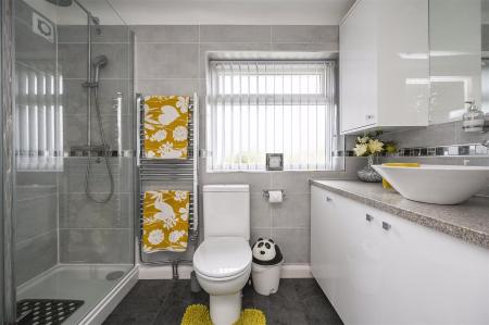 Shower Room - shower cubicle with mixer shower, fitted base units with wash hand basin, wall units and mirror, low level w.c, tiled walls, spotlights to ceiling, heated towel rail, two double glazed windows