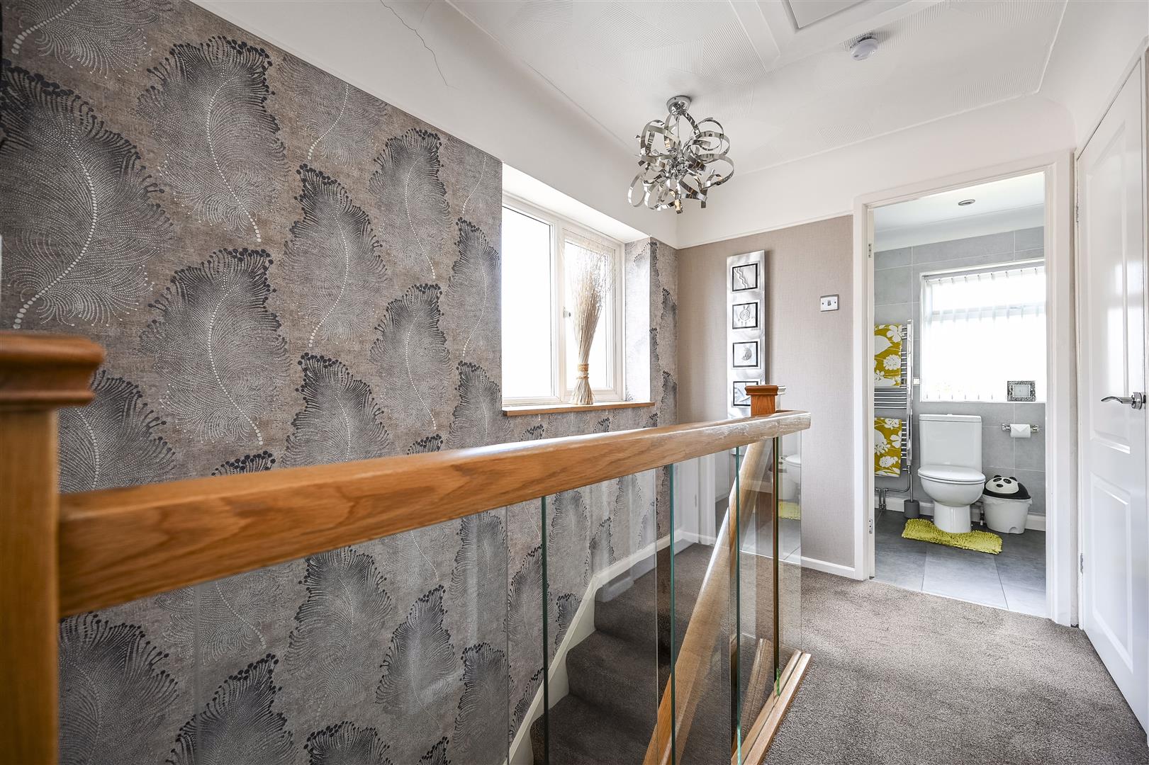 First Floor Landing - storage cupboard, access to loft with pull-down ladder to boarded loft area with light, double glazed window