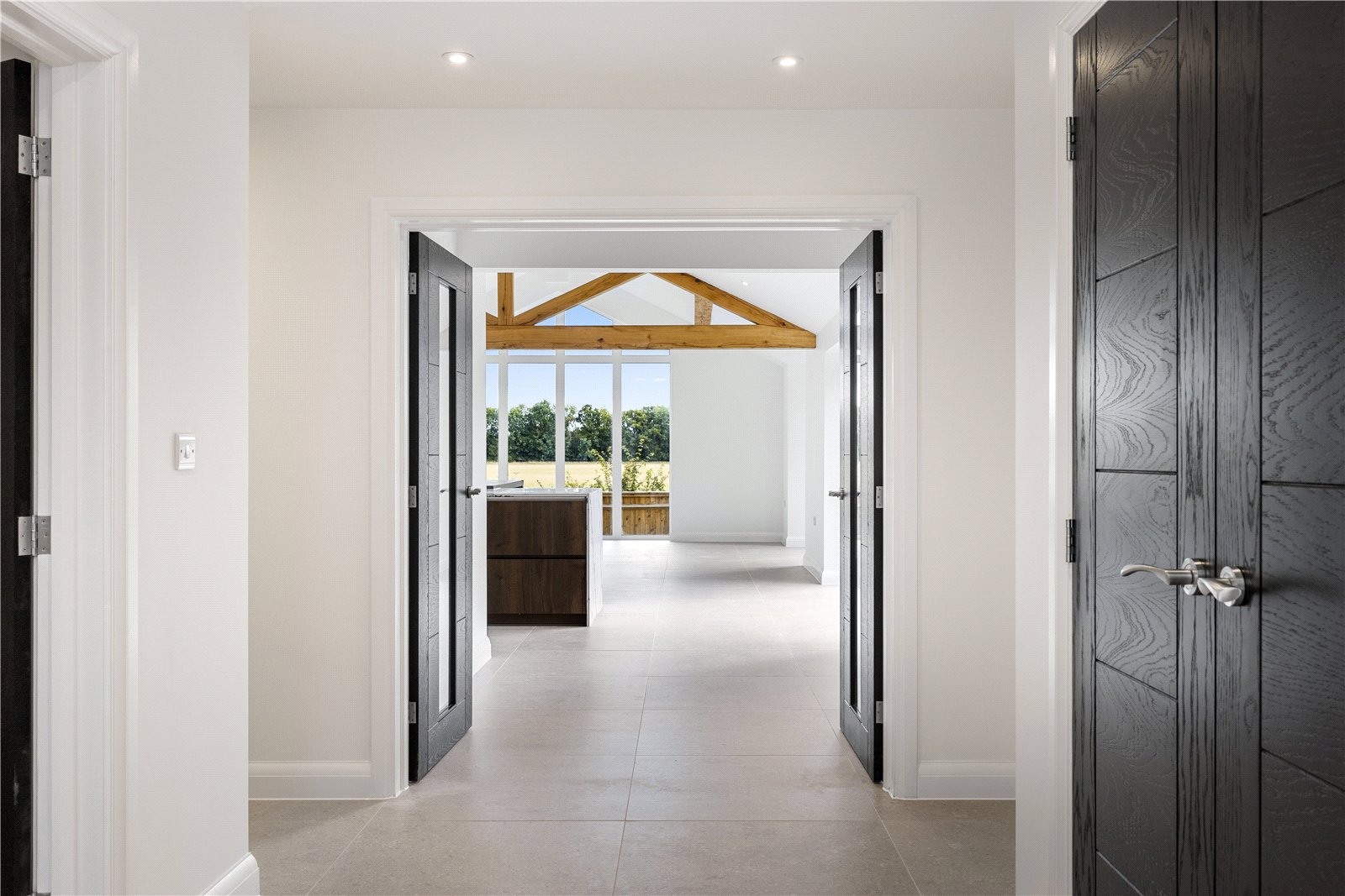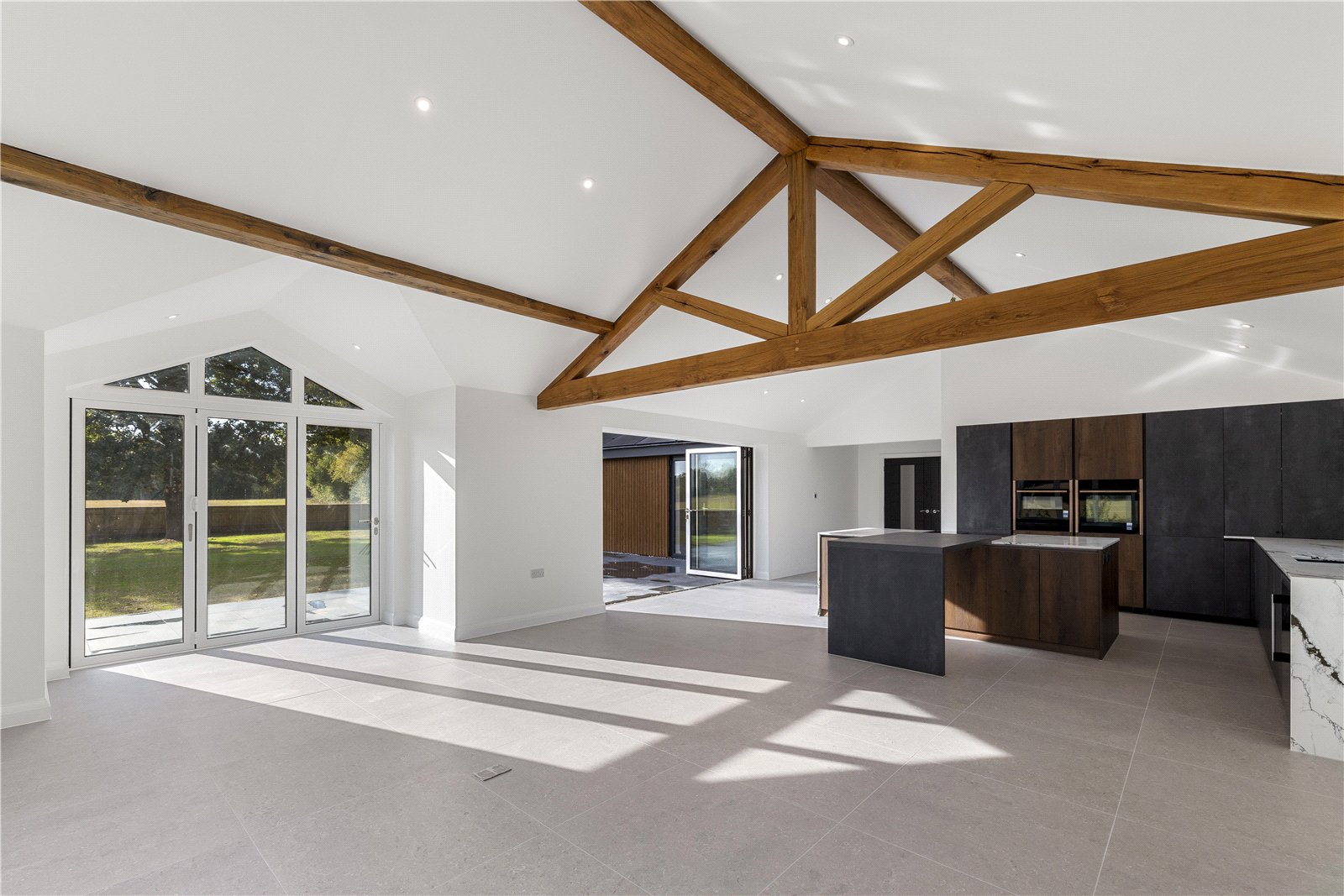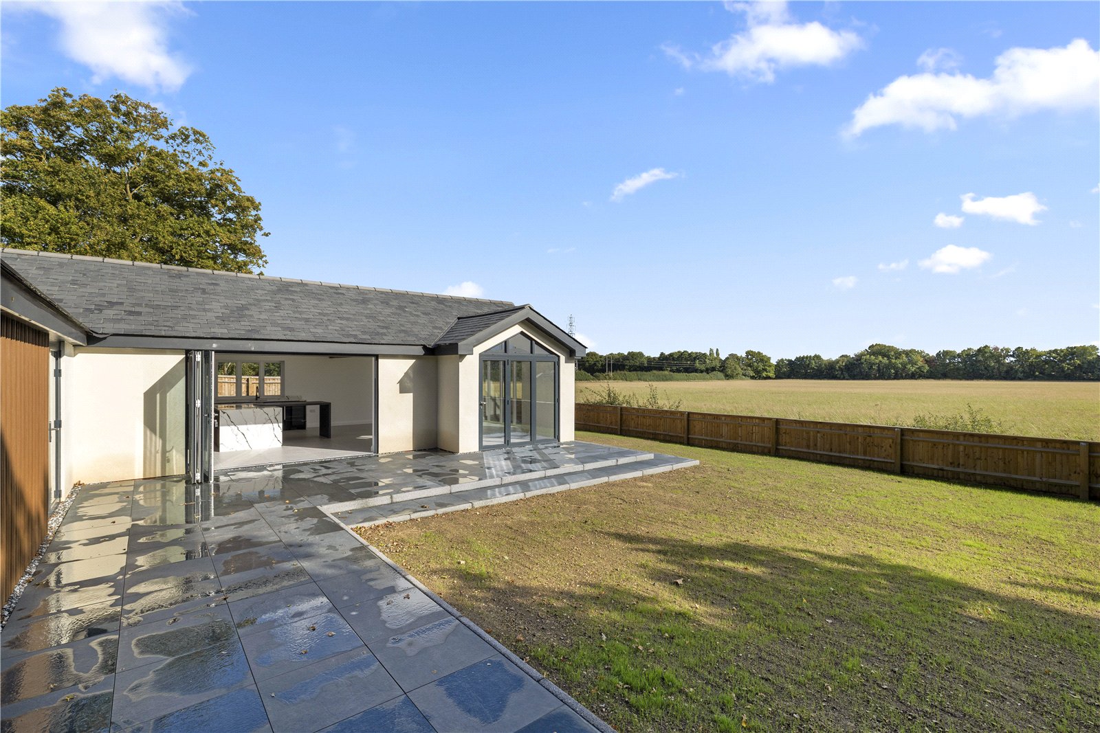 noir by david cliff - SEMI-RURAL NEWLY BUILT HOME! Semi-Rural Retreat with Detached Double Garage & Stunning Views! If you are looking for somewhere to make home with a real 'wow factor' then look no further, this one will blow you away! This luxury home is situated on an impressive plot in a desirable semi-rural location within a stones throw to the fine dining, Michelin star restaurant "The Braywood".Nestled in the tranquil and picturesque setting of Littlefield Green, Little Oak is a newly built, beautifully designed three-bedroom, detached bungalow offering modern living. Upon arrival to this rare find, you'll be greeted with an electric gate into the secluded and private setting of Little Oak. The first thing you'll notice is the substantial driveway leading you to the detached double garage. The property is entered through an impressive open porch leading to a spacious reception hall with a built-in storage cupboard and adjoining guest cloakroom. Double doors lead into an outstanding open plan living, kitchen dining room with a stunning full height vaulted ceiling and a glass gable end window taking full advantage of the beautiful countryside views. Additionally there are two sets of bi-folding doors which open seamlessly onto the adjoining patio terrace ideal for alfresco dining and entertaining. The contemporary style kitchen with a large central island boasts high end integrated Neff appliances, ample amounts of storage, a Quooker hot-tap and wine fridge, completed with Quartz work surfaces incorporating a sociable breakfast bar. There is also an adjoining utility / boot room with fitted units and built in Bosch washing machine and tumble dryer. The property offers three generous double bedrooms, two of which benefit from doors opening directly onto the garden terrace. Bedrooms two and three are served by a luxuriously appointed and fully tiled family bathroom complete with high quality Hansgrohe fittings. The spacious principal bedroom is a real show stopper with bi-folding doors onto the patio/garden area for you to take your morning coffee and enjoy the peaceful countryside views. This bedroom has the added luxury of a fully tiled en-suite shower room, with high end fittings and large walk-in shower unit. Externally you'll find the phenomenal open views of Little Oak, a really secluded and private setting for you to enjoy. With deer's in the distance and the sun beaming in to the expansive south facing garden, this is the perfect place to call home. There are plenty of mature trees making this a truly private & stunning outdoor space.