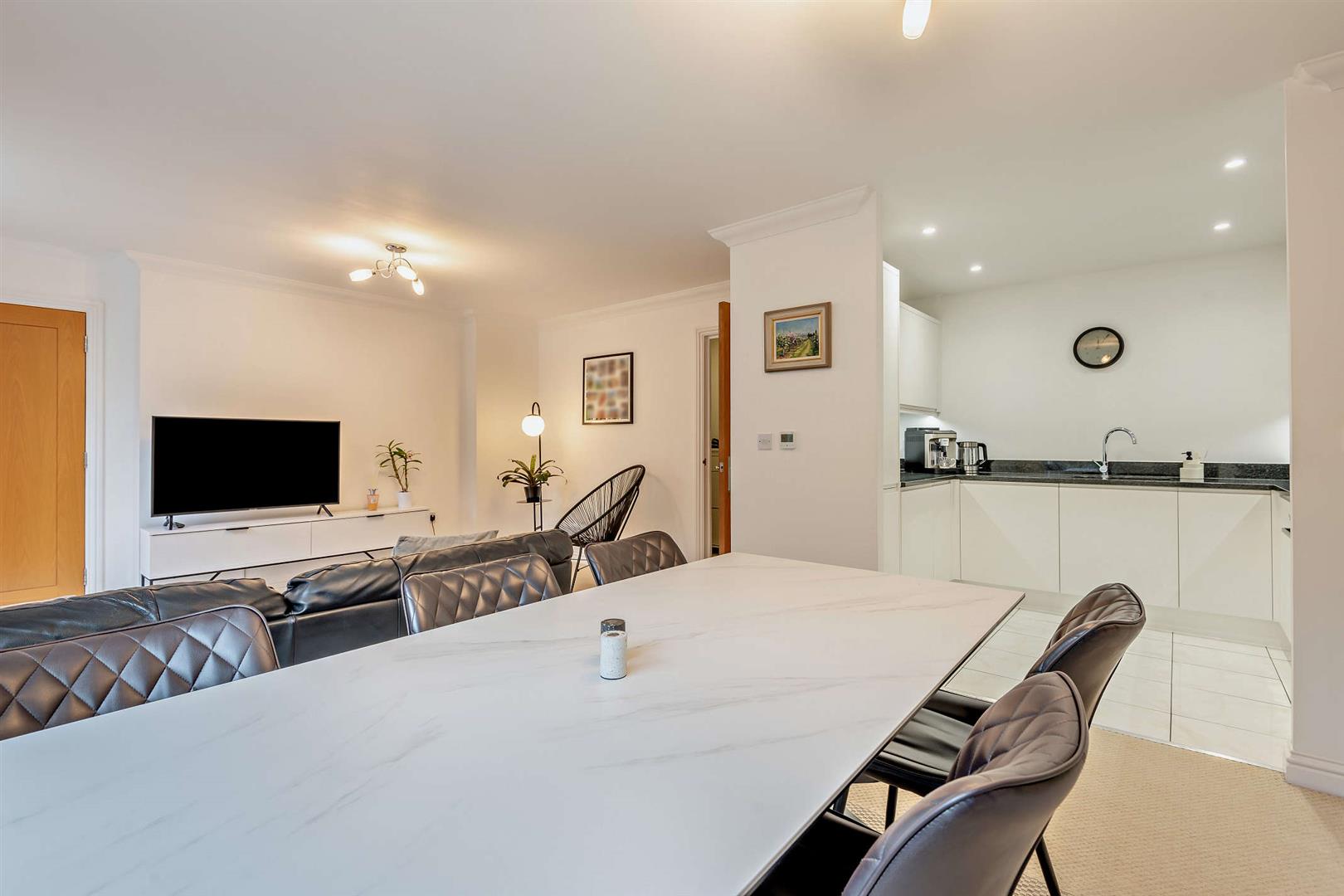 From the communal entrance door, you can take the lift or the stairs to the first floor. Upon entering, you are greeted by a spacious hallway with built-in storage, which leads seamlessly into a bright and airy open-plan living and dining area. This inviting space features double doors opening onto a private balcony, overlooking the beautifully maintained communal gardens, creating the perfect spot to relax. The apartment also benefits from a fully fitted modern kitchen and underfloor heating throughout, adding comfort and a sense of luxury to the home.