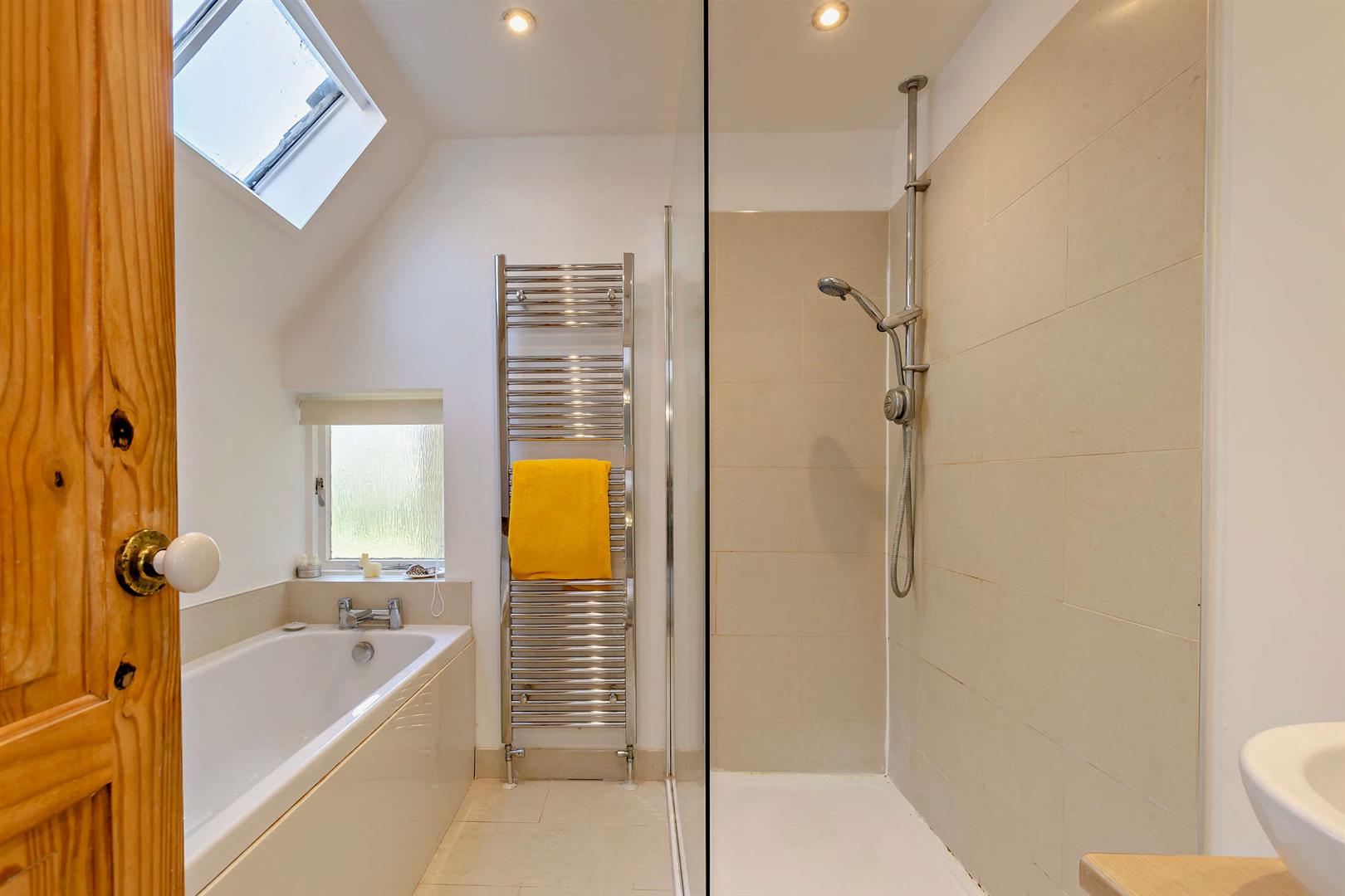 Family Bathroom - Panelled bath with mixer tap. Shower cubicle with Aqualisa shower unit. Wash hand basin in vanity unit with drawer under. Skylight. Chrome radiator/towel rail. Window to the front elevation. Wall mirror. Inset ceiling lighting. Part tiled walls. Tiled flooring.