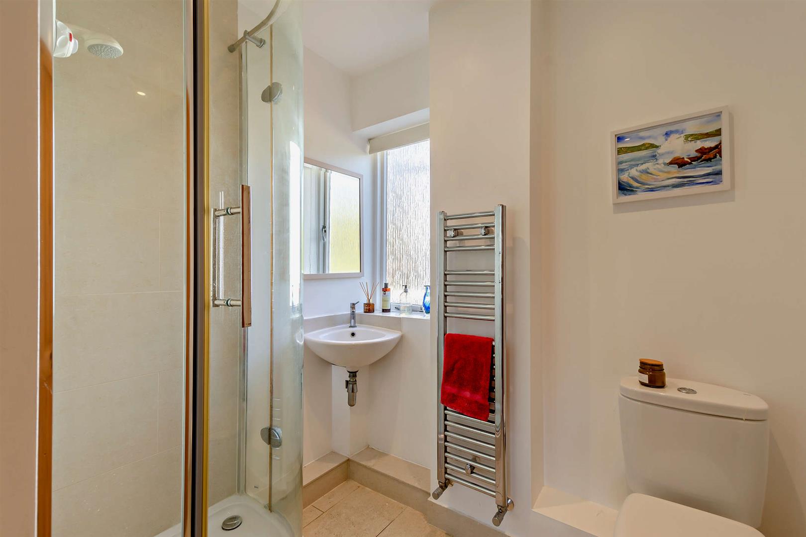 Cloaks/Shower Room - Shower cubicle with Mira shower unit. Corner wash hand basin. Low-level WC, Chrome radiator/towel rail. Window to the side elevation. Tiled flooring. Inset ceiling lighting.