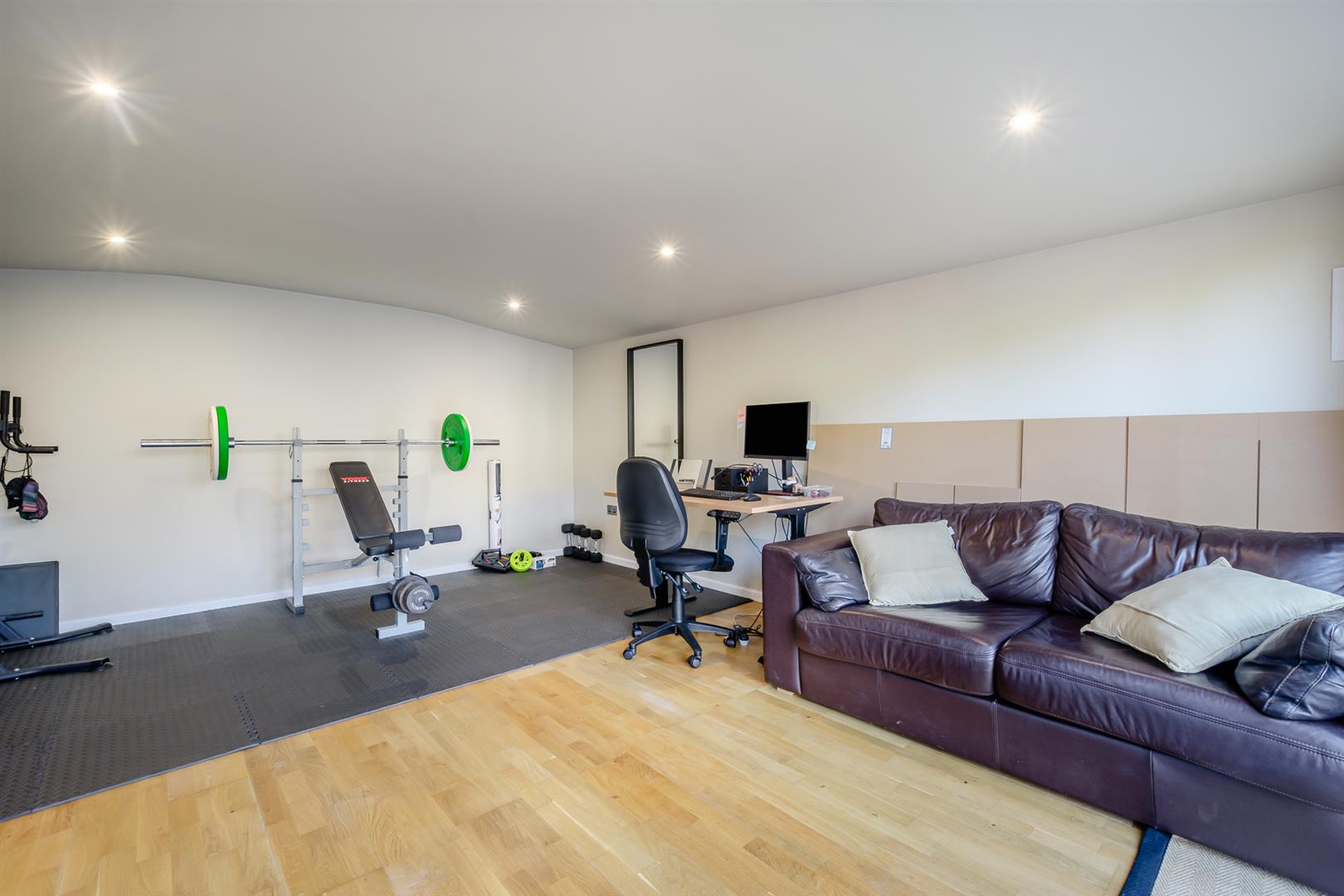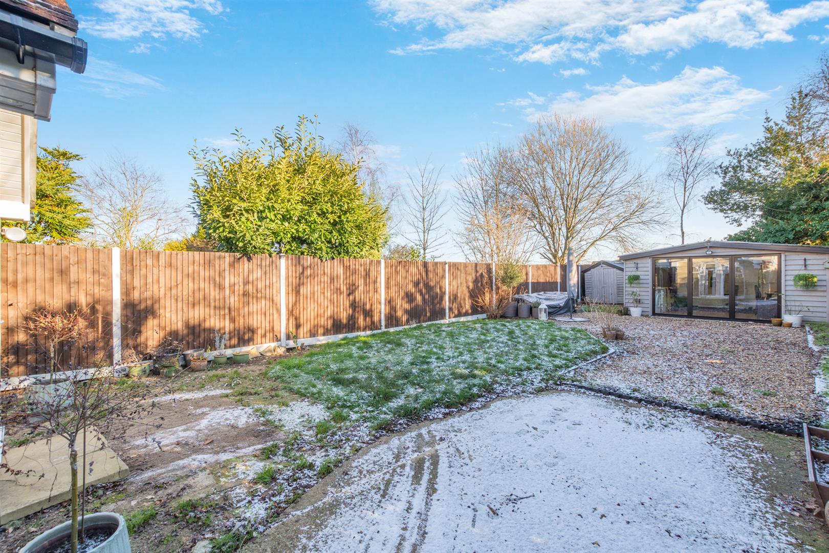 Externally, the property features a large block-paved driveway providing ample off-road parking, with double wooden gates to the side leading to additional parking, a shingle driveway and a superb detached studio. This versatile space is ideal for use as a home office, cinema room or gym. The private rear garden is neatly enclosed, mainly laid to lawn with well-stocked borders and mature hedging, and enjoys open fields to the rear.