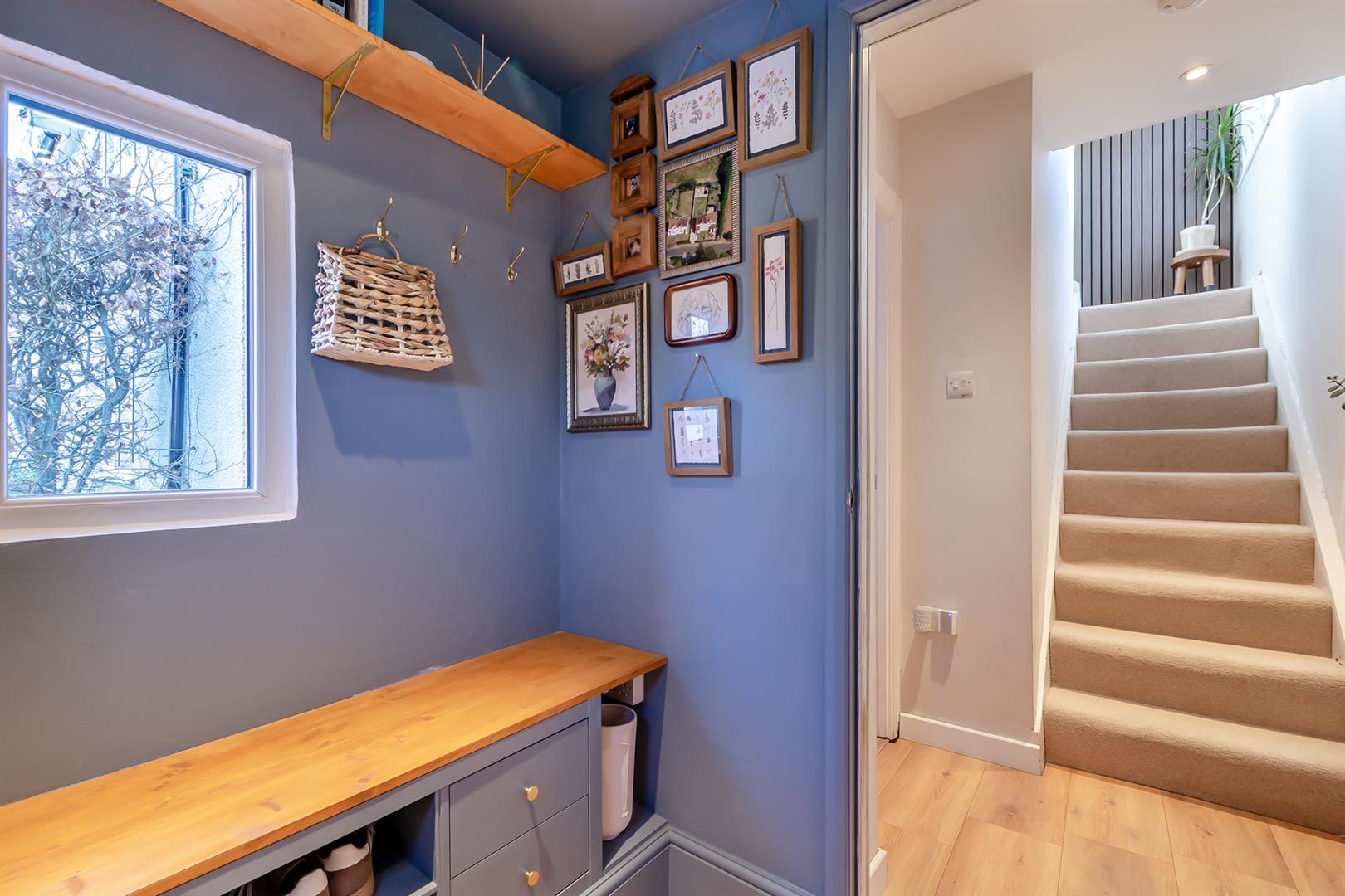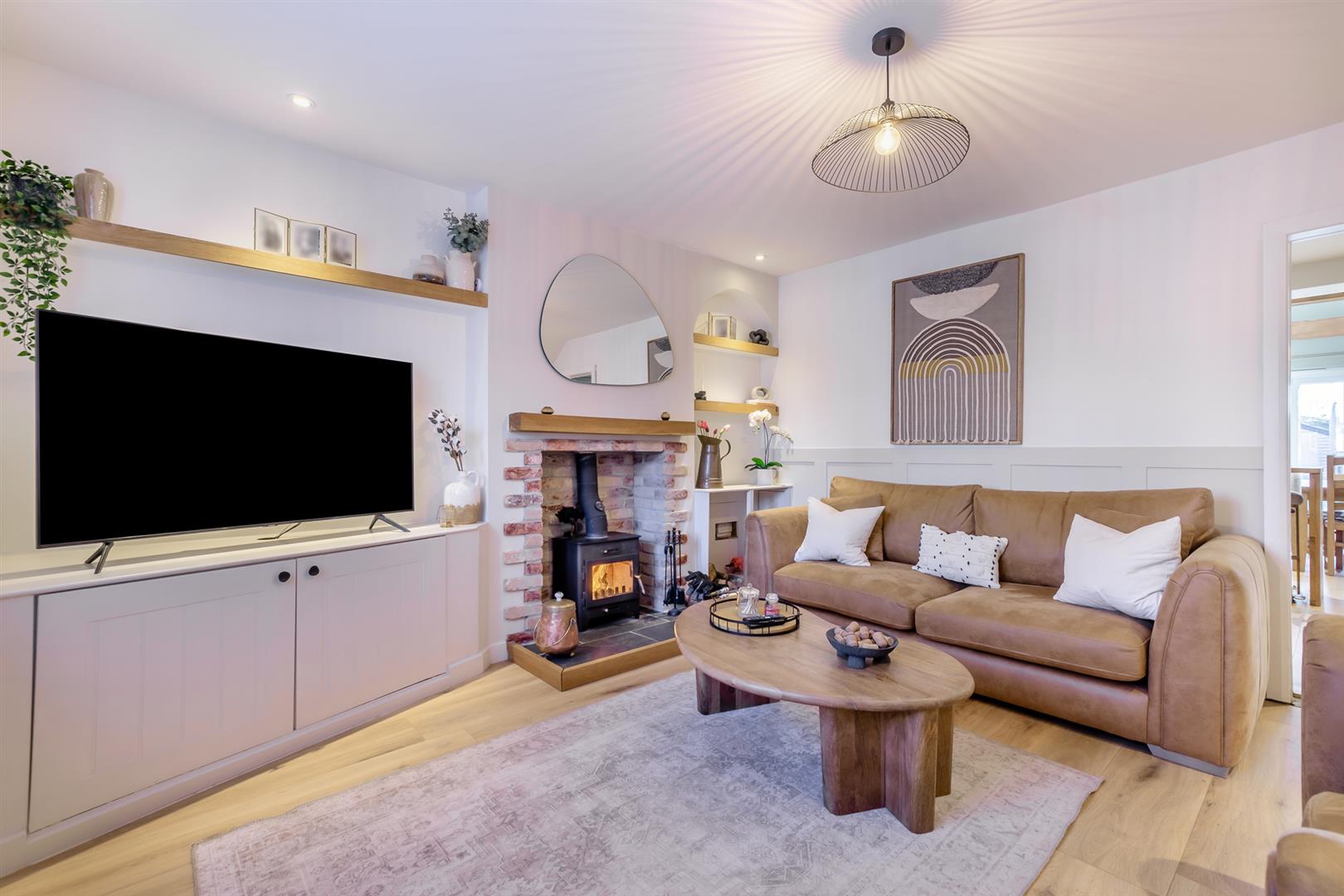 The home offers spacious and versatile accommodation and has been thoughtfully extended. The ground floor comprises an entrance porch with useful storage cupboards, a welcoming hallway, and a lounge featuring a log burner and an understairs storage cupboard which has been utilised as a study. The lounge flows through to the impressive open-plan kitchen/diner, fitted with a high-specification kitchen including a breakfast bar, utility area and a beautiful dining space benefitting from underfloor heating, electric Velux windows and French doors opening onto the rear garden.