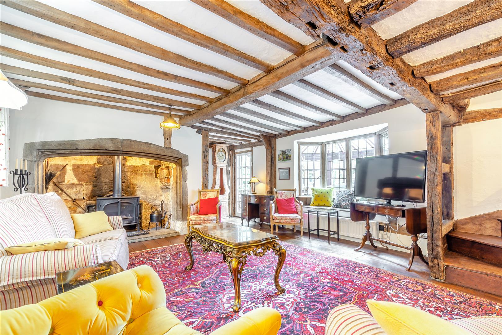 The layout is both practical and full of charm. A stylish kitchen was refitted in 2023 with quartz worktops, limestone flooring, and integrated Neff appliances. This opens into a breakfast area and a bright dining room with views over open countryside. A mahogany conservatory with terracotta tile flooring and heat-resistant glass offers further living space, while the main sitting room is full of character with exposed beams, oak flooring, and an inglenook fireplace with log burner.