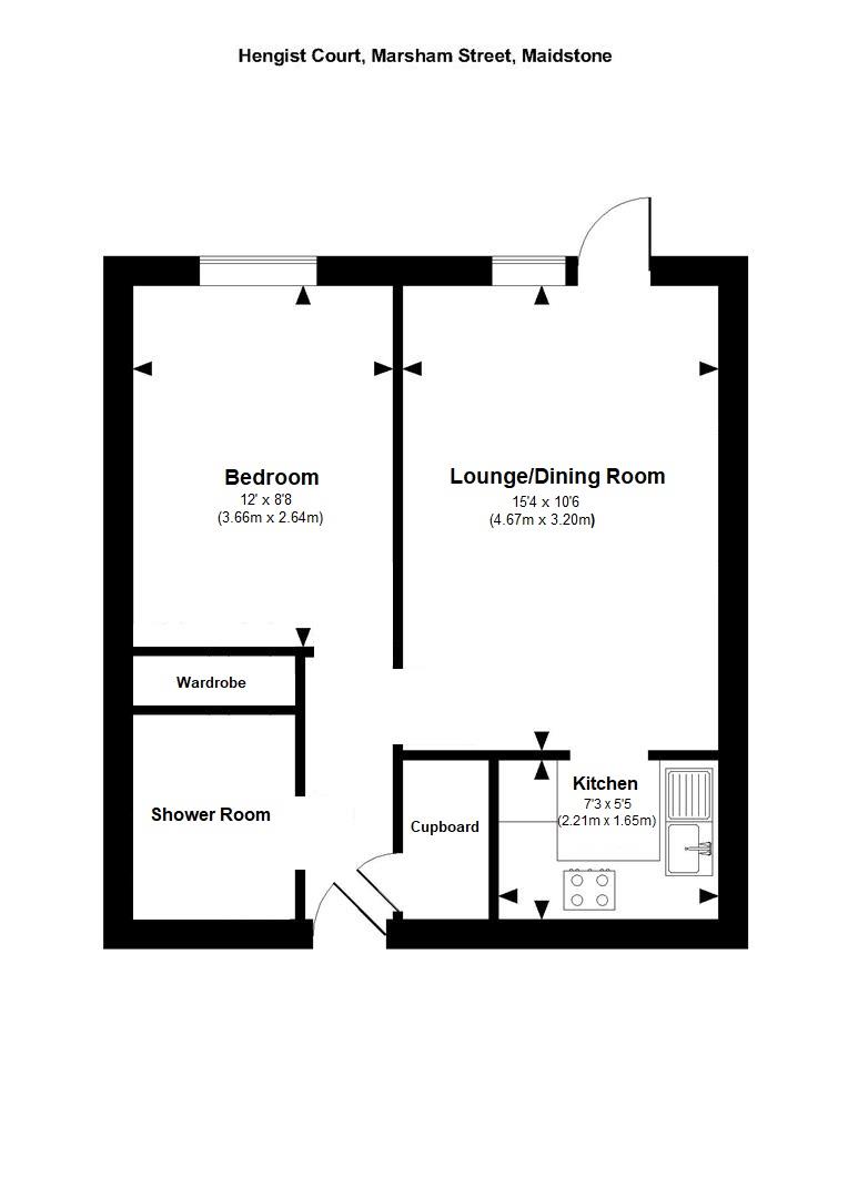 Lounge/Dining Room: - 4.67m x 3.20m (15'4 x 10'6) - Attractive fireplace with inset electric fire. Electric heater. Double glazed door opening to a small patio area and communal gardens.