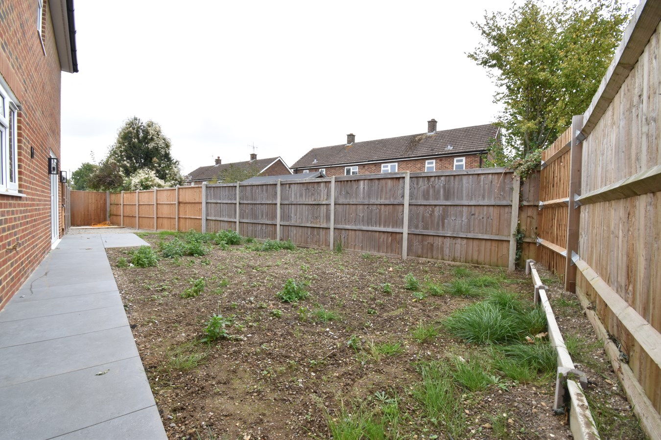 Mix of porcelain tiled areas and space for lawn to be laid. Enclosed with fenced boundaries. Water tap. Lighting.