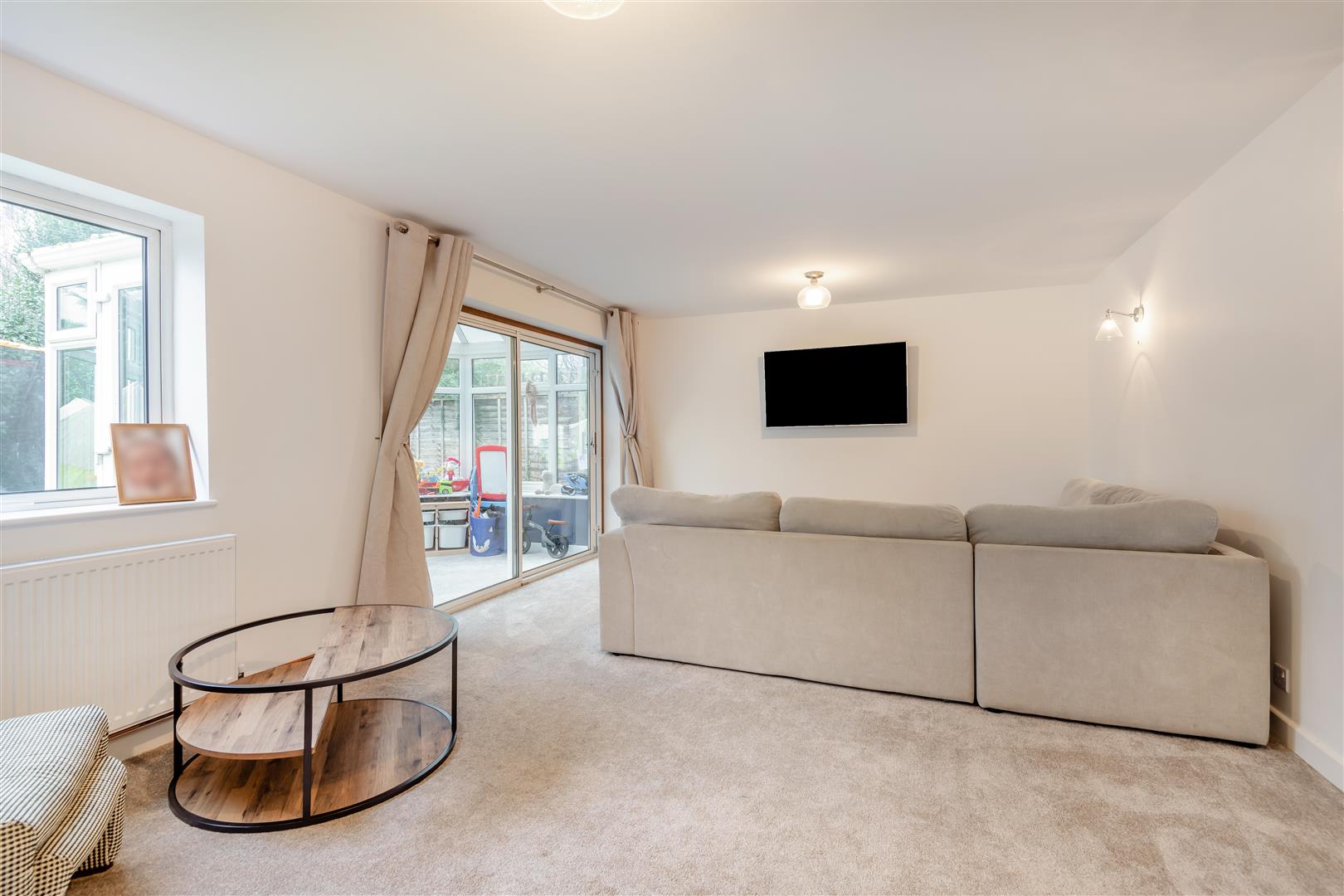 The ground floor features a welcoming entrance hall with stairs leading to the first floor, a convenient guest cloakroom, and a spacious, light-filled sitting room with doors opening into the conservatory. The modern, contemporary fitted kitchen flows seamlessly into the dining area, creating an ideal space for everyday living and entertaining.