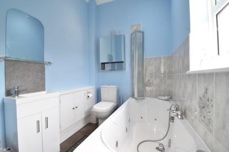 Double glazed obscured window to side. Modern suite comprising of low level WC, sink with vanity unit which continues along one wall, panelled bath with shower attachment. Heated towel rail. Mirrored wall unit. Vinyl flooring. Extractor and recess lighting. Shaver point.